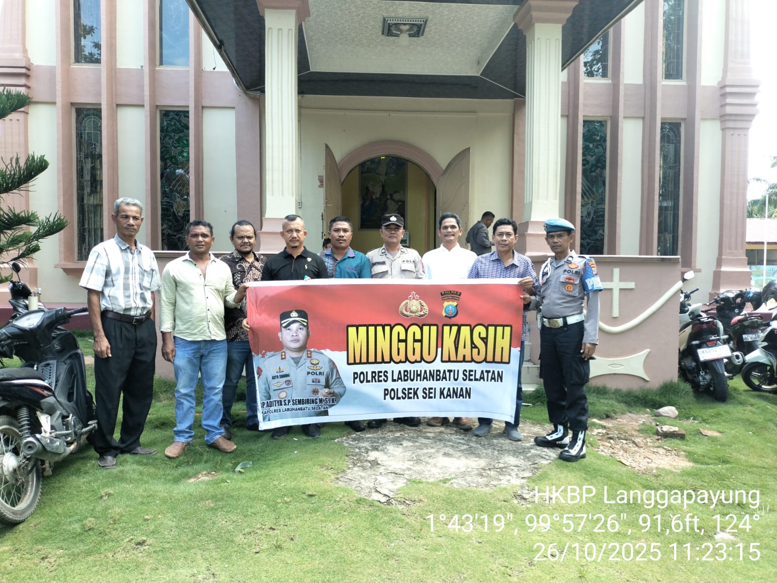 Dalam upaya mempererat silaturahmi antara Polri dan masyarakat serta menjaga situasi keamanan dan ketertiban, personel Polsek Sungai Kanan Polres Labuhanbatu Selatan melaksanakan kegiatan “Minggu Kasih” di Gereja HKBP Langgapayung, Kecamatan Sungai Kanan, Kabupaten Labuhanbatu Selatan, pada Minggu (26/10/2025).