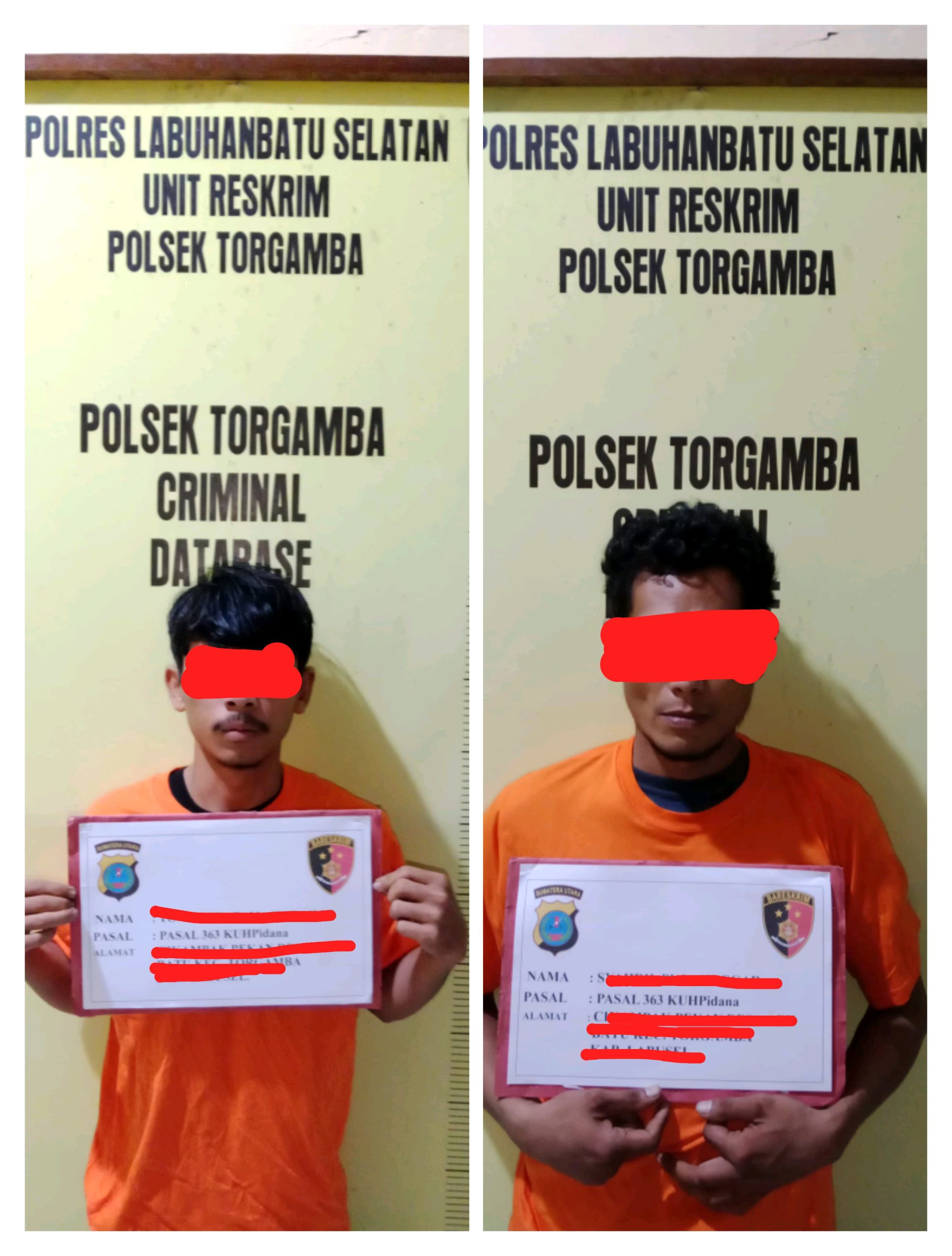 Berdasarkan hasil penyelidikan dan penyidikan, tim Polsek Torgamba yang dipimpin Kanit Reskrim Polsek Torgamba, IPDA Dapot Tua Simanjuntak, S.H., M.H., berhasil mengidentifikasi dan menangkap dua orang tersangka, yaitu TPH (lk/31 tahun) dan SPS (lk/32 tahun), keduanya warga Dusun Cikampak Pekan, Desa Aek Batu, Kecamatan Torgamba, Kabupaten Labuhanbatu Selatan.