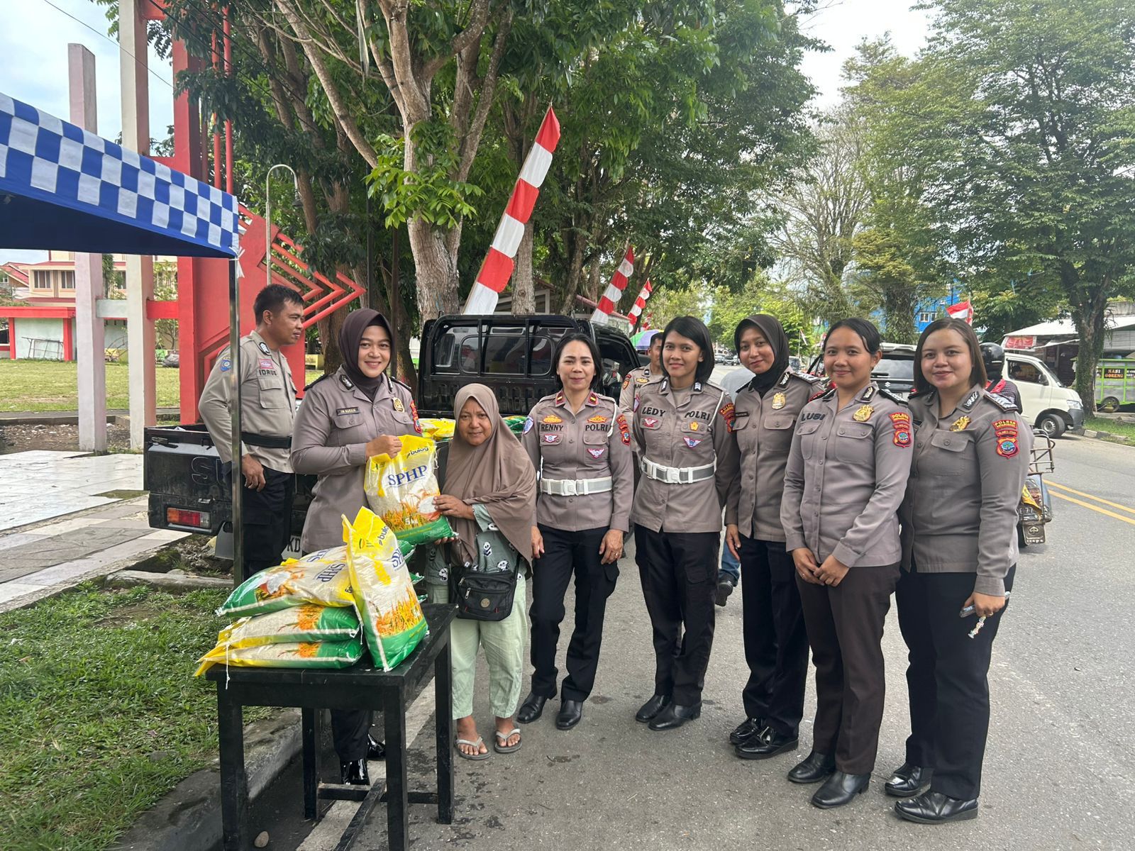 Personil Polisi Wanita (Polwan) ikut serta menggelar gerakan pangan murah untuk masyarakat Kota Kotamobagu, Sabtu (30/8/2025).