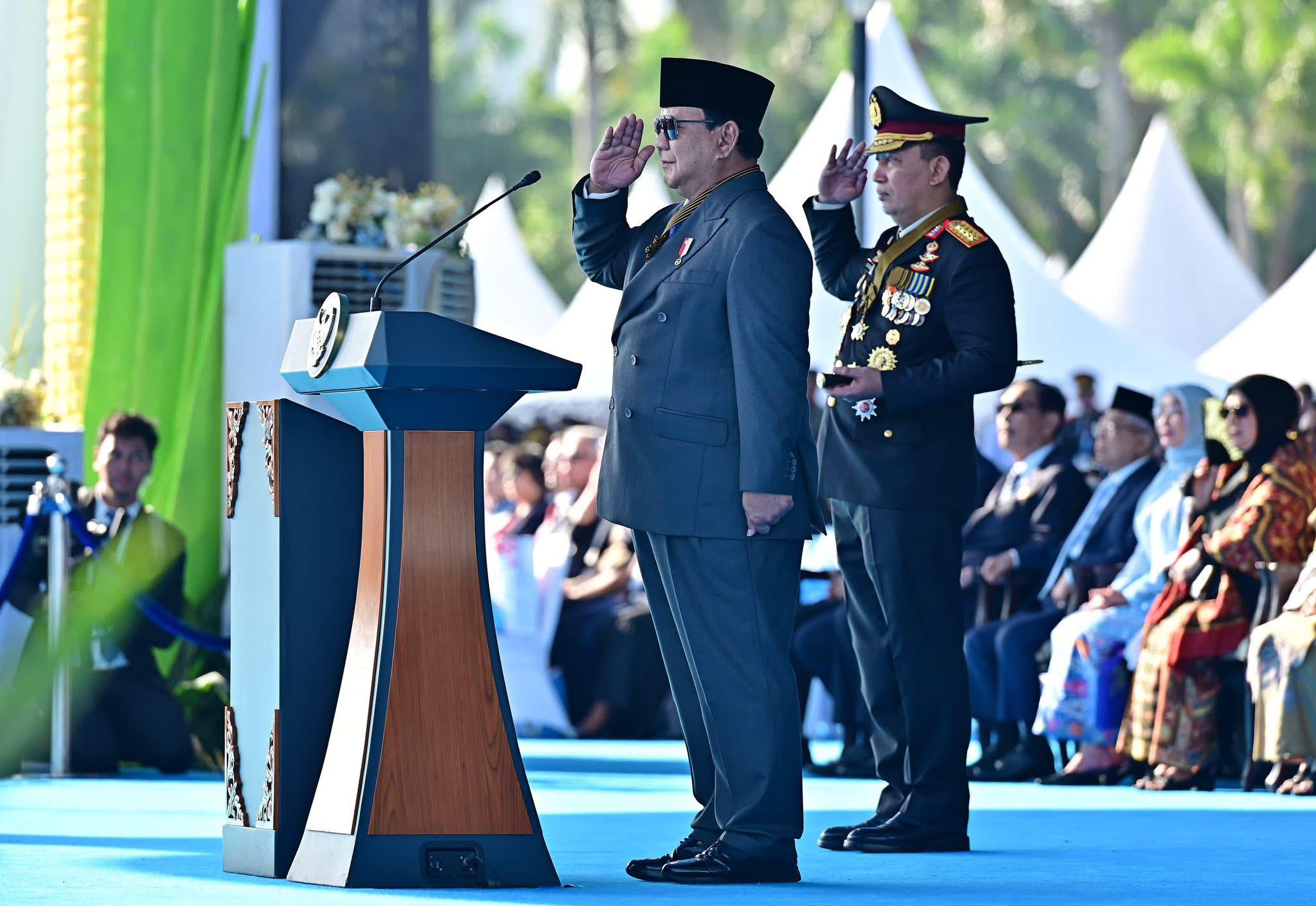 Presiden Prabowo Subianto Bertindak Selaku Inspektur Upacara Memimpin Upacara Peringatan ke-79 Hari Bhayangkara Tahun 2025 yang digelar di Monumen Nasional (Monas), Jakarta, pada Selasa, 1 Juli 2025.