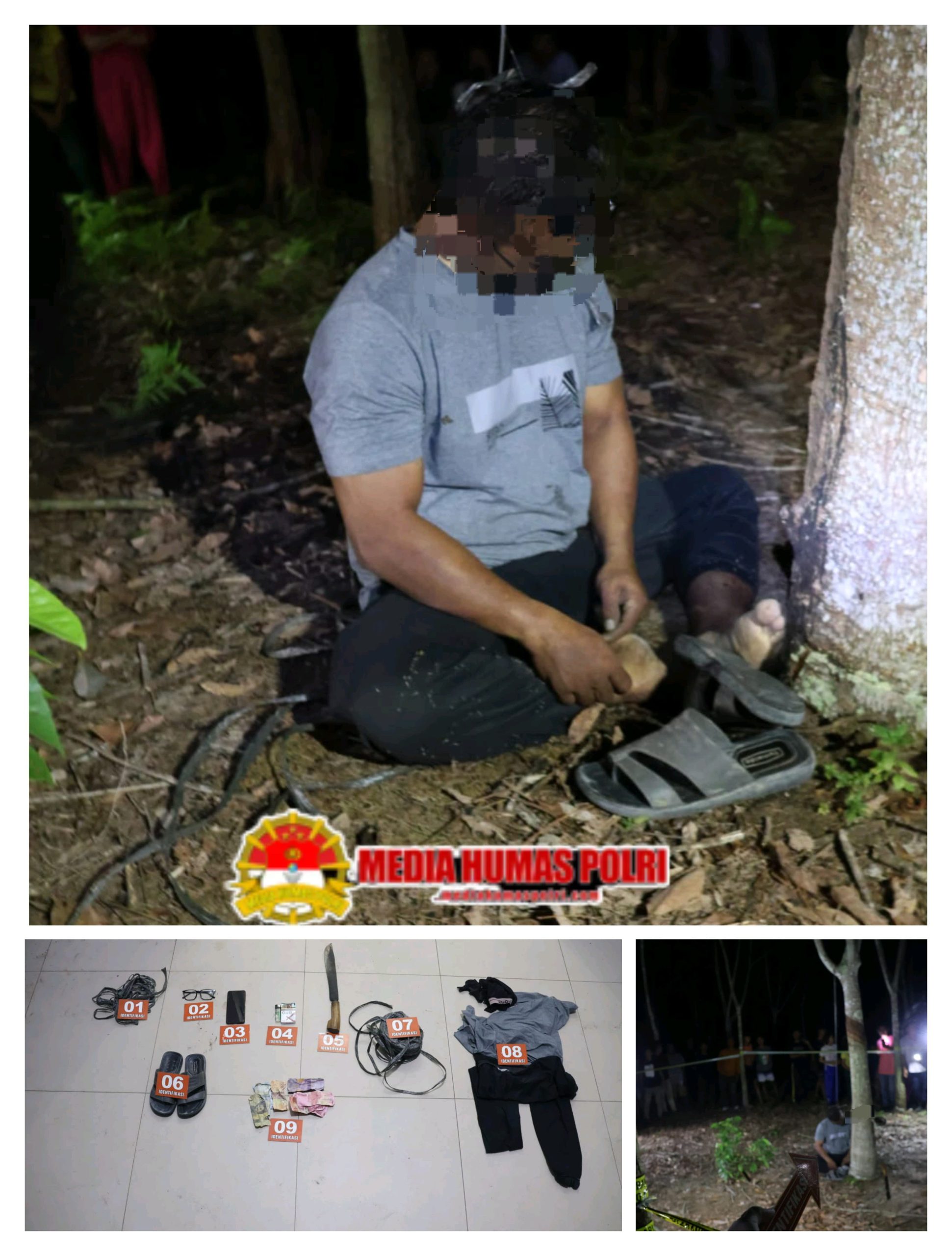 Di TKP, Polisi menemukan sejumlah barang bukti, termasuk sebilah parang, telepon genggam Oppo, sepasang sandal, rokok, serta sejumlah uang tunai.