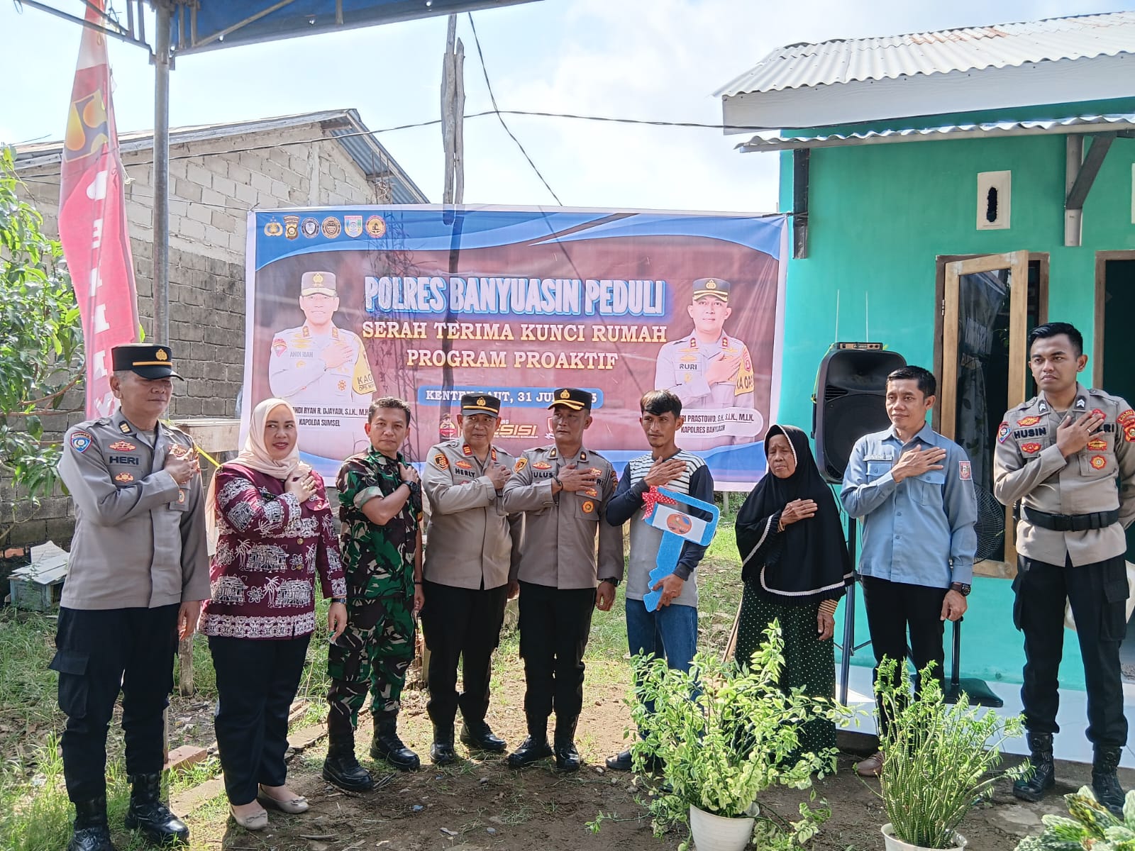 Program Proaktif Polres Banyuasin Peduli, Kapolres Banyuasin AKBP Ruri Prastowo SH SIK MIK diwakili Kabag Logistik Polres Banyuasin Kompol Tulus Julianto SH, menyerahkan kunci rumah pasca dibedah di Desa Kenten Laut, Kecamatan Talang Kelapa.