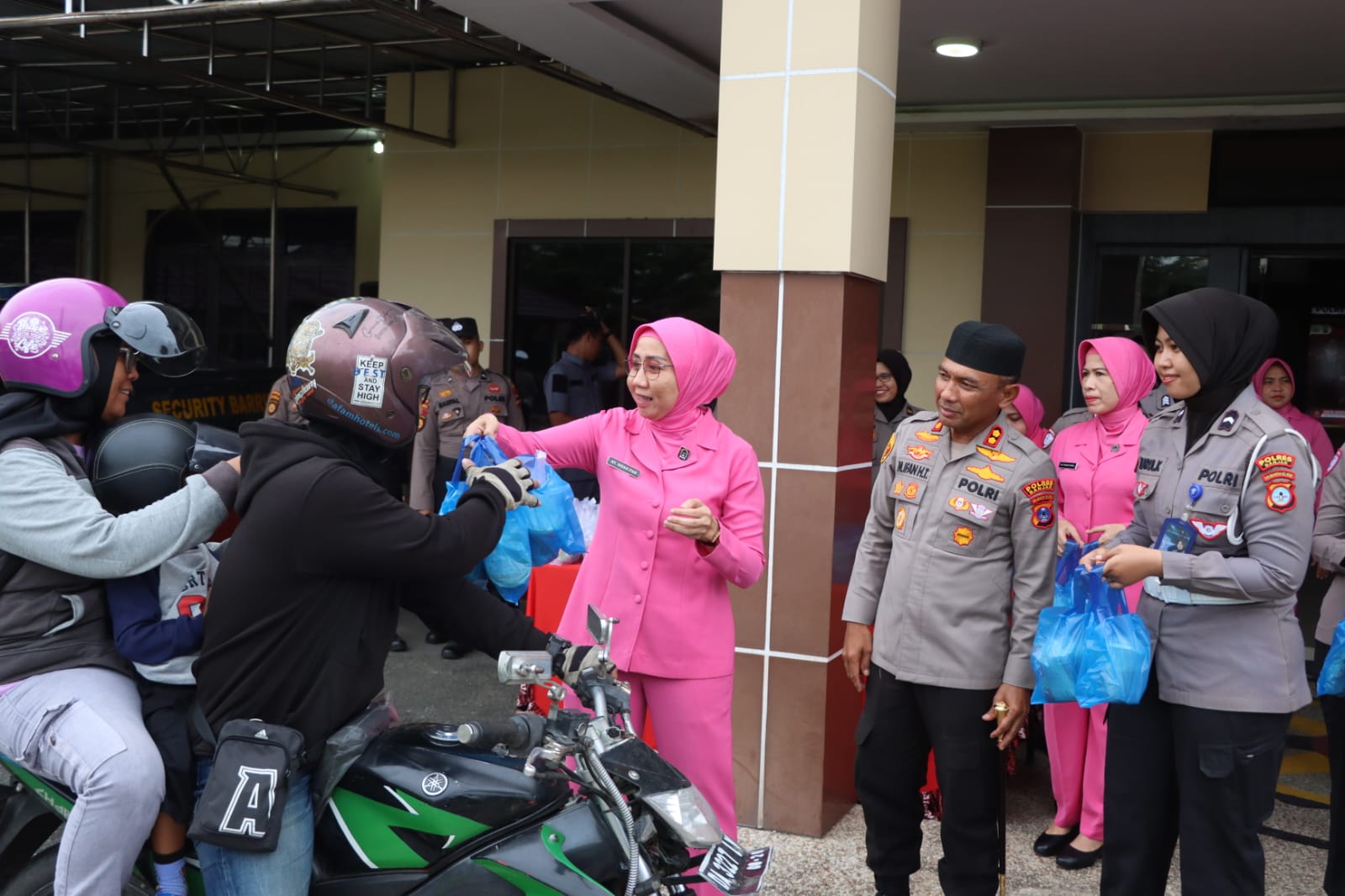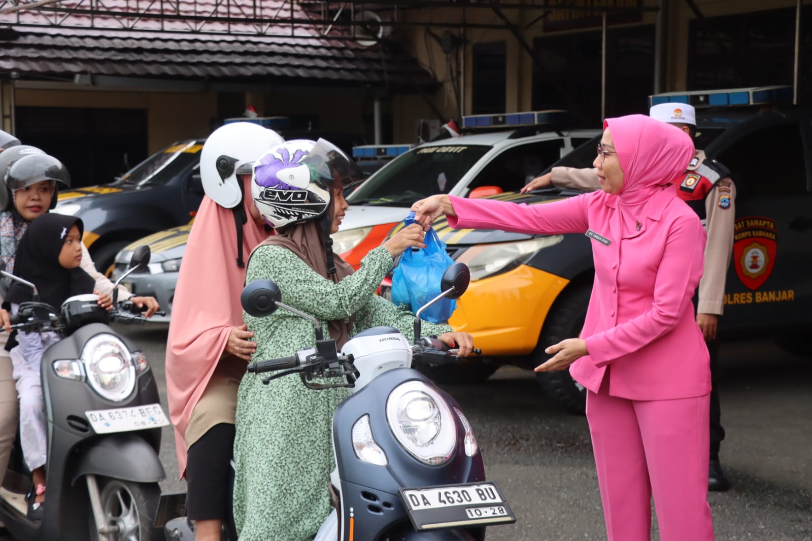 Kapolres Banjar Polda Kalsel AKBP M. Ifan Hariyat didampingi Ketua Bhayangkari Cabang Banjar, Wakapolres Banjar, PJU Polres Banjar, serta perwira dan pengurus Bhayangkari Cabang Banjar, turut serta membagikan ratusan paket takjil kepada pengendara dan masyarakat yang melintas.
