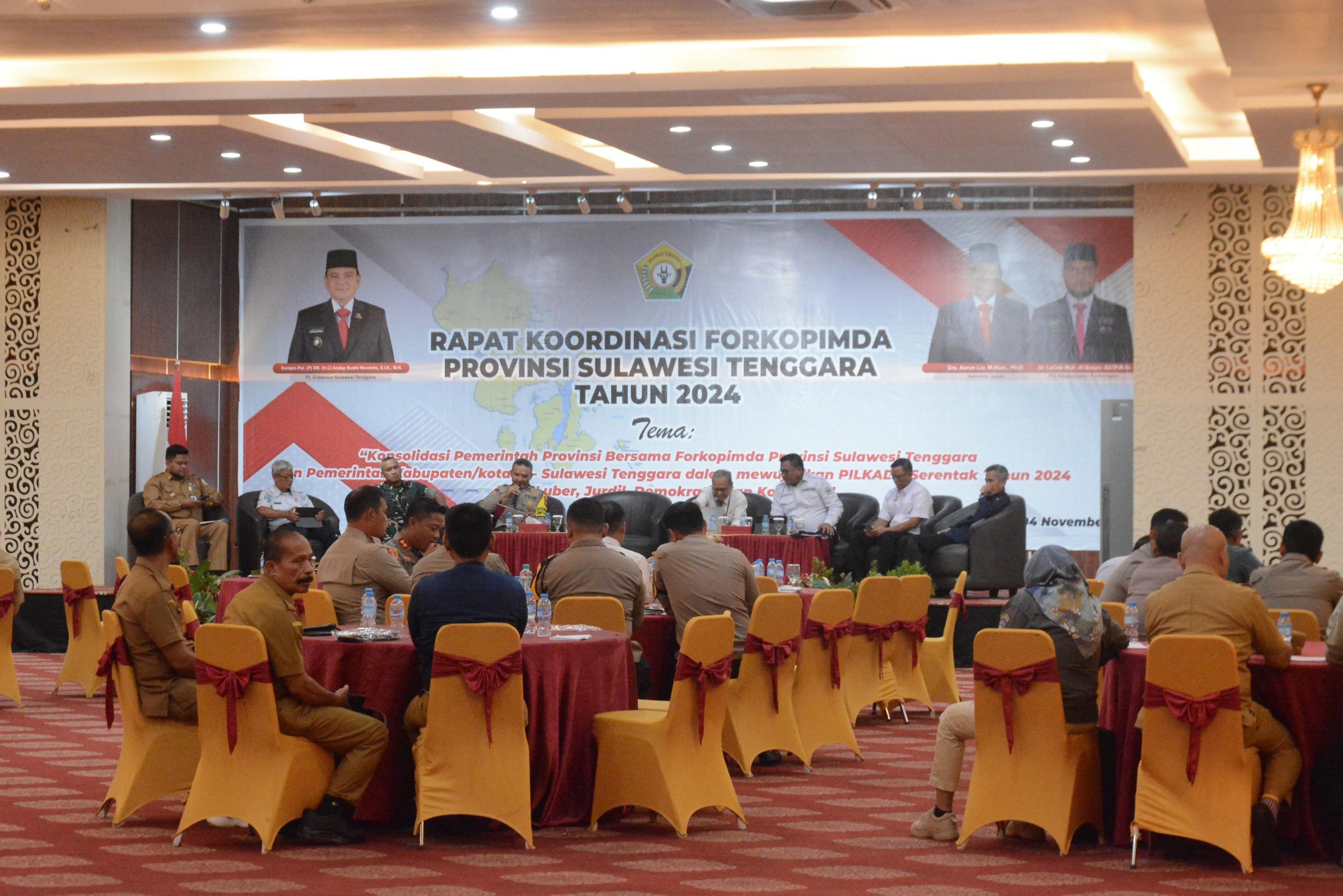 Forkopimda Provinsi Sulawesi Tenggara menggelar Rapat Koordinasi di Hotel Plaza Inn Kendari pada Senin pagi, membahas persiapan menjelang Pilkada Serentak dengan tujuan memastikan pelaksanaannya berjalan secara langsung, umum, bebas, rahasia, jujur, adil, demokratis, dan kondusif. Rapat dimulai pukul 09.00 WITA dan dihadiri oleh pejabat utama dari pemerintahan provinsi dan kabupaten/kota se-Sulawesi Tenggara.