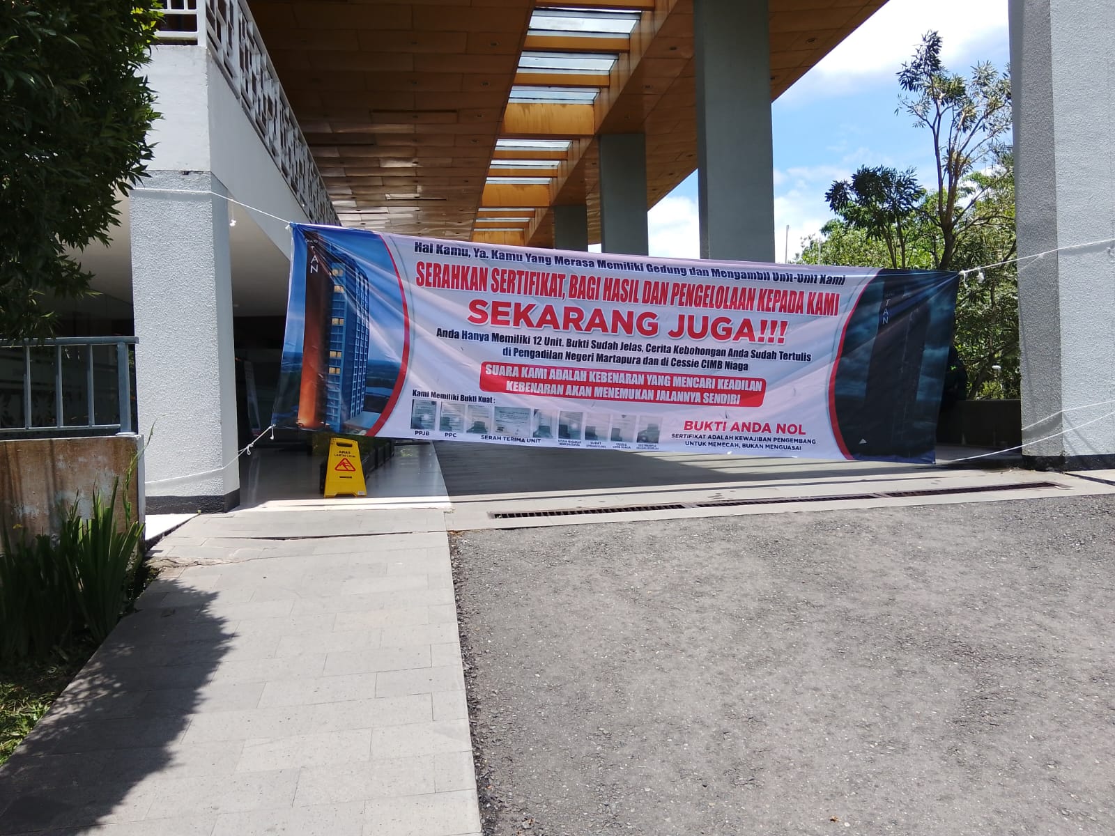 Tak tinggal diam, pemilik condotel memasang spanduk besar di area Grand Tan Banjar bertuliskan “Stop Menggunakan Unit-Unit Kami untuk Kepentingan Pribadi” hingga “Bersiaplah, LP Kami Akan Terus Berjalan: Pasal Penipuan, Penggelapan, Penadahan Barang, hingga Pemufakatan Jahat.”