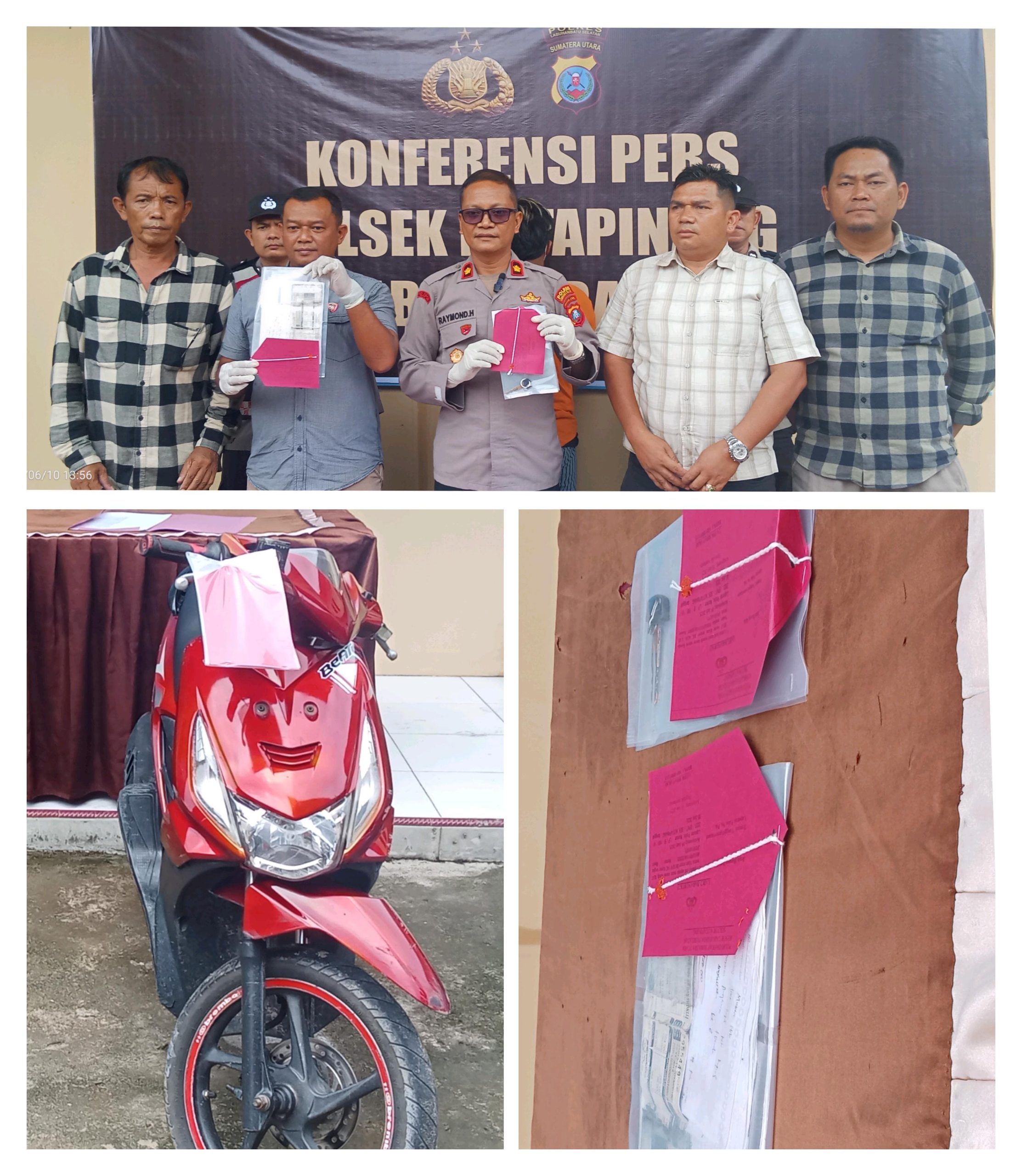 Barang bukti yang diamankan meliputi 1 unit sepeda motor Honda Beat warna merah dengan nomor polisi BK 6218 YAE, 1 buah kunci kontak, 1 lembar dokumen perjanjian jual beli sepeda motor, dan 1 lembar STNK.