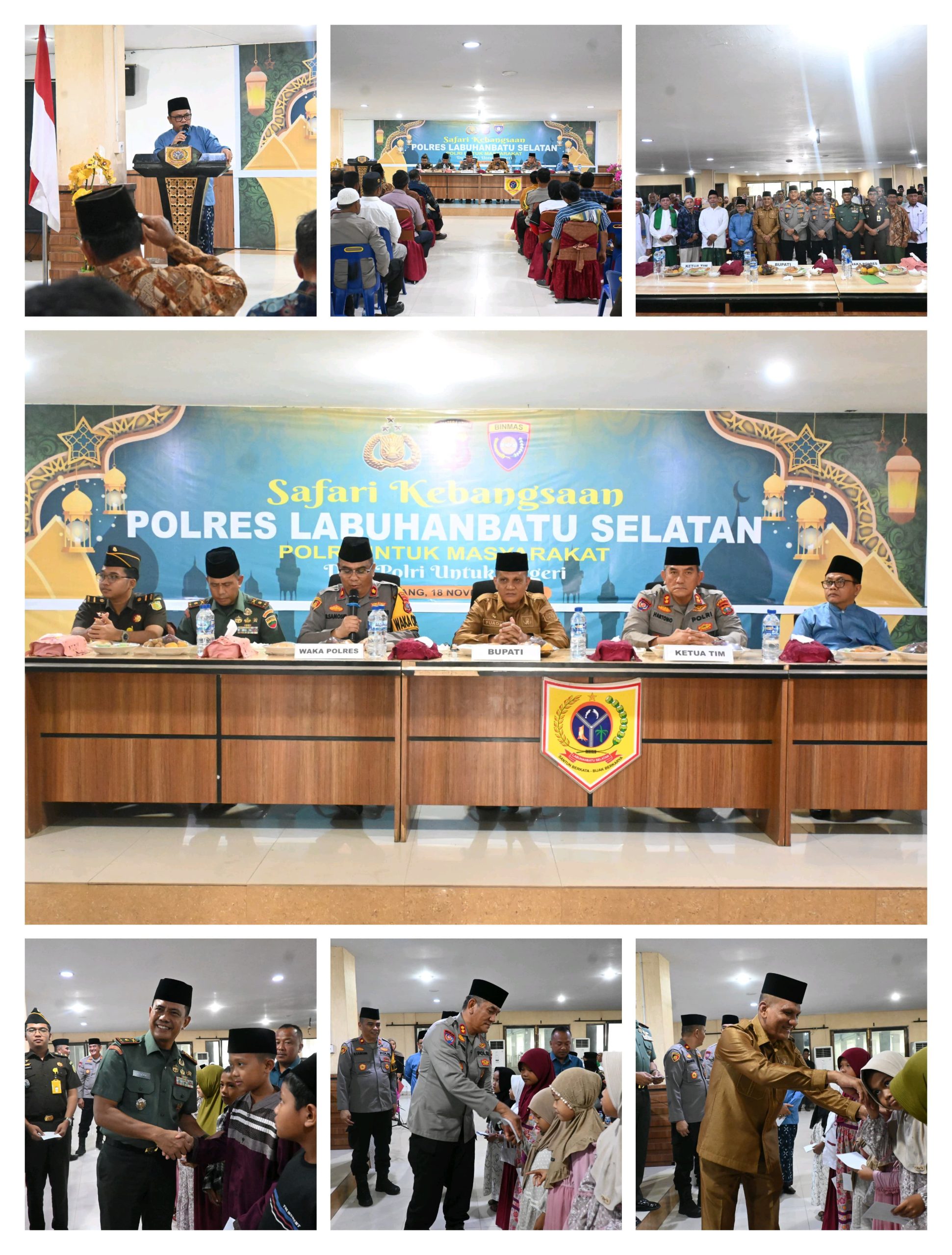 Labuhanbatu Selatan melaksanakan kegiatan *”Safari Kebangsaan Polres Labuhanbatu Selatan: Polri untuk Masyarakat”* di Aula Lantai 1 Kantor Bupati Labuhanbatu Selatan, Jalan Lintas Sumatera Kotapinang–Gunung Tua, Desa Sosopan, Kecamatan Kotapinang, Kabupaten Labuhanbatu Selatan, Selasa (18/11/2025). Kegiatan ini menjadi wadah silaturahmi sekaligus penguatan nilai kebangsaan di tengah masyarakat, dengan melibatkan unsur pemerintah, TNI–Polri, tokoh agama, tokoh adat, dan elemen masyarakat lainnya.
