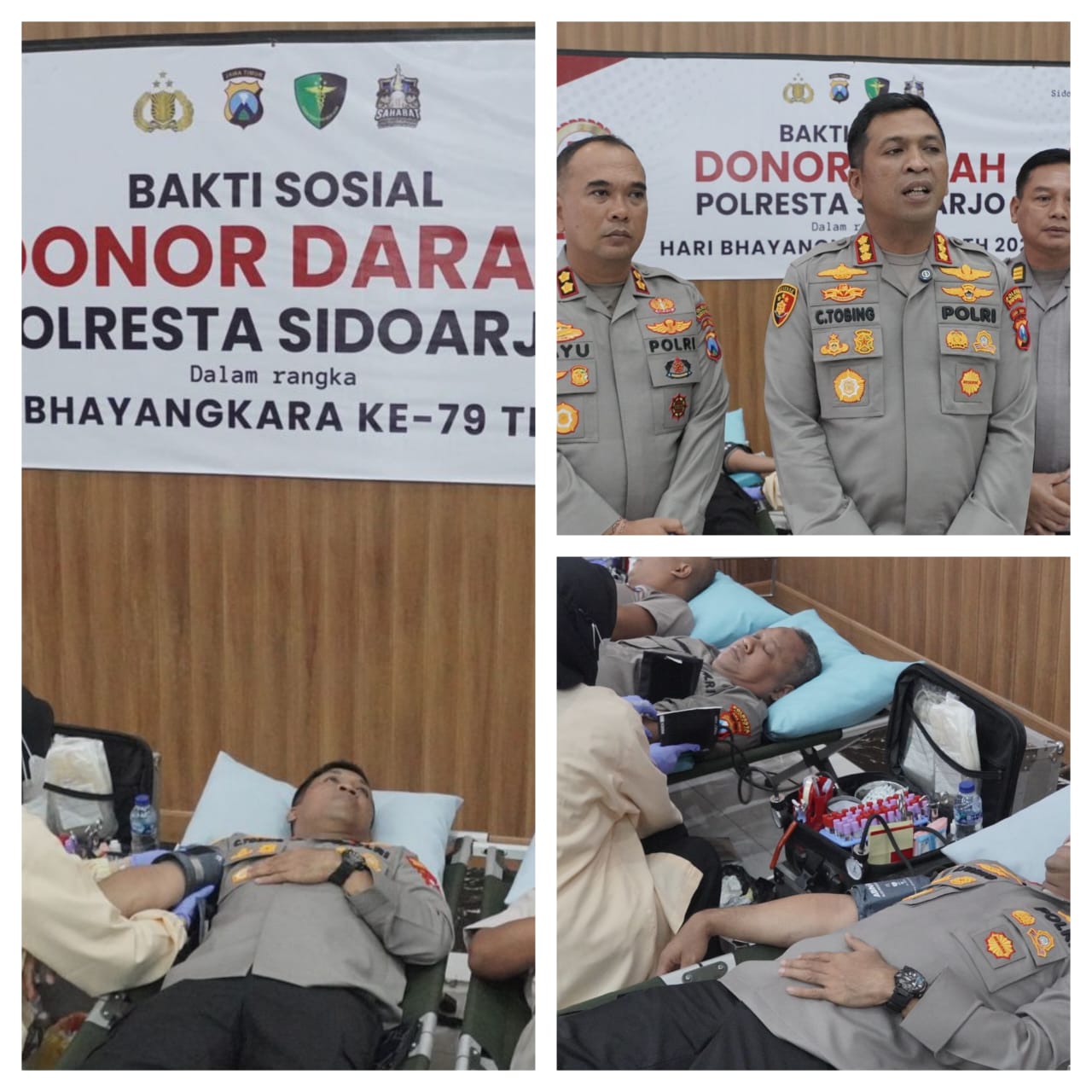 Dalam rangkaian kegiatan peringatan Hari Bhayangkara ke-79, Polresta Sidoarjo mengadakan bakti sosial donor darah. Kegiatan donor darah dibuka Kapolresta Sidoarjo Komisaris Besar Polisi Christian Tobing didampingi Wakapolresta Sidoarjo AKBP I Made Bayu Sutha Sartana, di Gedung Serbaguna Polresta Sidoarjo, pada Selasa (10/6/2025).
