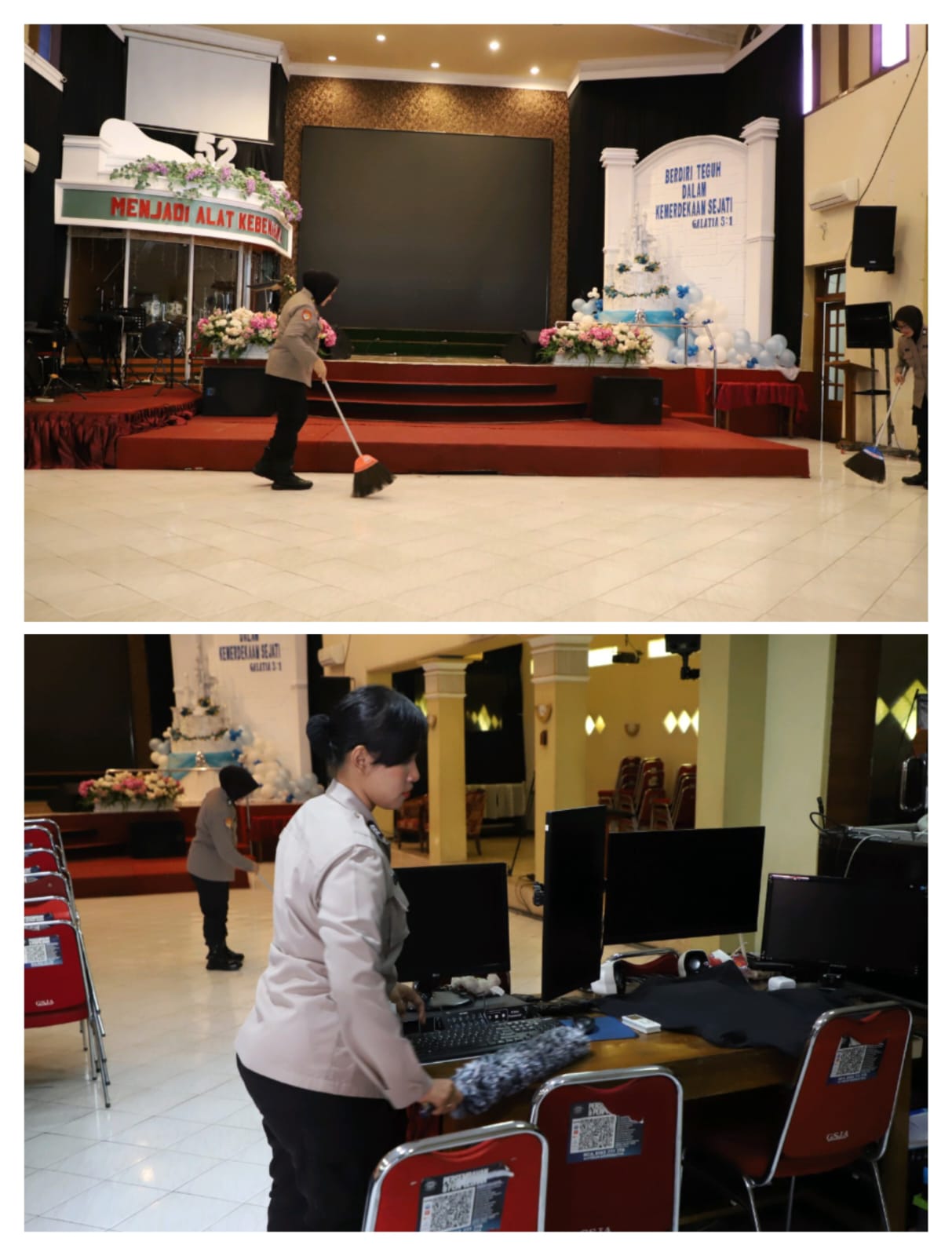 Masih dengan menggunakan baju Dinas, para Polwan mulai dalam hingga luar masjid dibersihkan dan dirapikan, dengan menggunakan peralatan sederhana seperti kain Lap, penyedot debu untuk karpet, sapu ijuk dan kain pel, untuk membersihkan lantai, kaca dan tempat wudu.