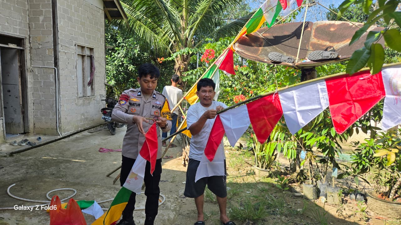 Dalam semangat menyambut Hari Ulang Tahun ke-80 Kemerdekaan Republik Indonesia, Bhabinkamtibmas Desa Prangat Selatan, Briptu Fhatur Al Akhmad Ramadhan, S.H., bersama warga RT 02 melaksanakan kegiatan gotong royong pemasangan umbul-umbul di lingkungan mereka, Kecamatan Marangkayu, Kabupaten Kutai Kartanegara.