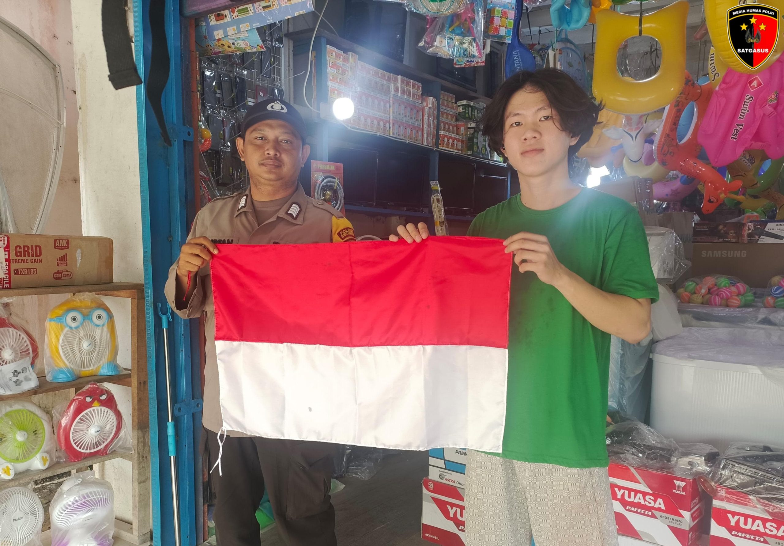 Sebanyak 10 bendera diserahkan secara langsung oleh Bhabinkamtibmas Bripka Syarif kepada masyarakat sebagai simbol ajakan untuk turut memeriahkan bulan kemerdekaan dengan mengibarkan Merah Putih di halaman rumah masing-masing..