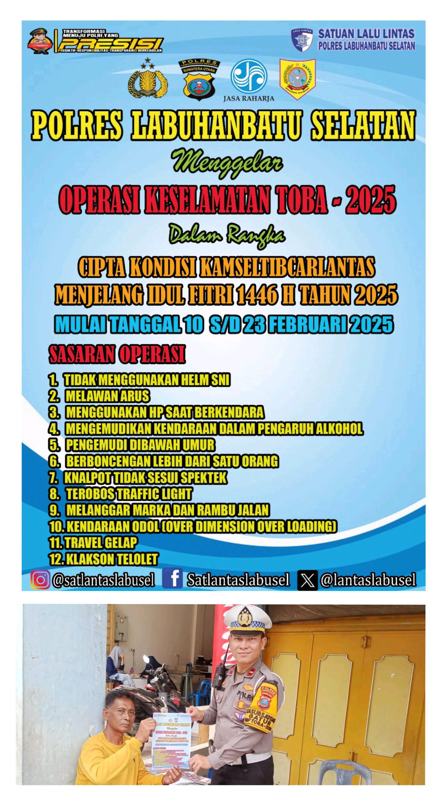 Dalam rangka menciptakan kondisi keamanan, keselamatan, ketertiban, dan kelancaran lalu lintas (Kamseltibcarlantas) menjelang Idulfitri 1446 H, Satuan Lalu Lintas (Sat Lantas) Polres Labuhanbatu Selatan melaksanakan Operasi Keselamatan Toba 2025.