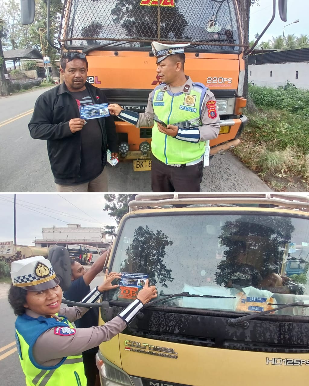 Satuan Lalulintas (Sat Lantas) Polres Pematangsiantar melalui Kanit Kamsel IPDA Serly Tarigan SH melaksanakan pembagian brosur dan stiker larangan Overload dan Overdimensi di Jalan Parapat Kecamatan Siantar Marimbun Kota Pematangsiantar pada hari Kamis 19 Juni 2025 pagi sekira pukul 08.00 Wib.