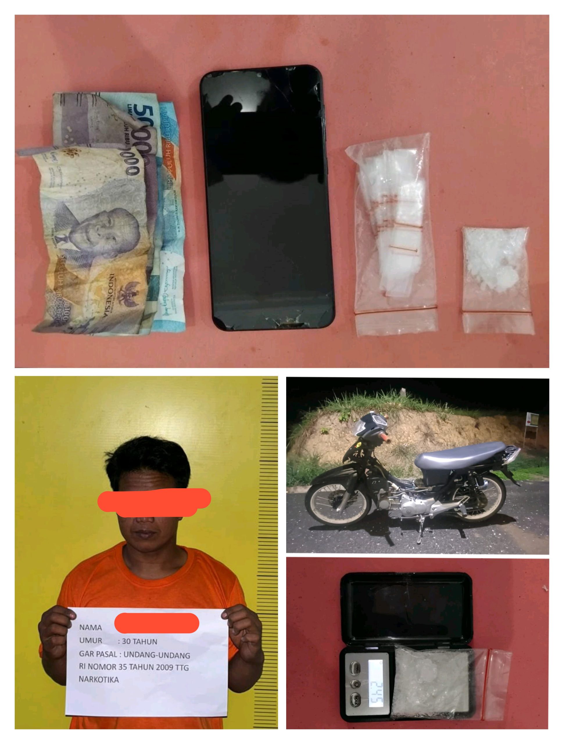 Dari tangan tersangka, polisi mengamankan barang bukti berupa satu paket plastik klip transparan berisi sabu seberat 2,45 gram brutto, satu unit sepeda motor Supra X 125 tanpa plat nomor, satu bungkus plastik klip kosong, satu unit ponsel Samsung hitam, dan uang tunai Rp120.000 yang diduga hasil penjualan sabu.