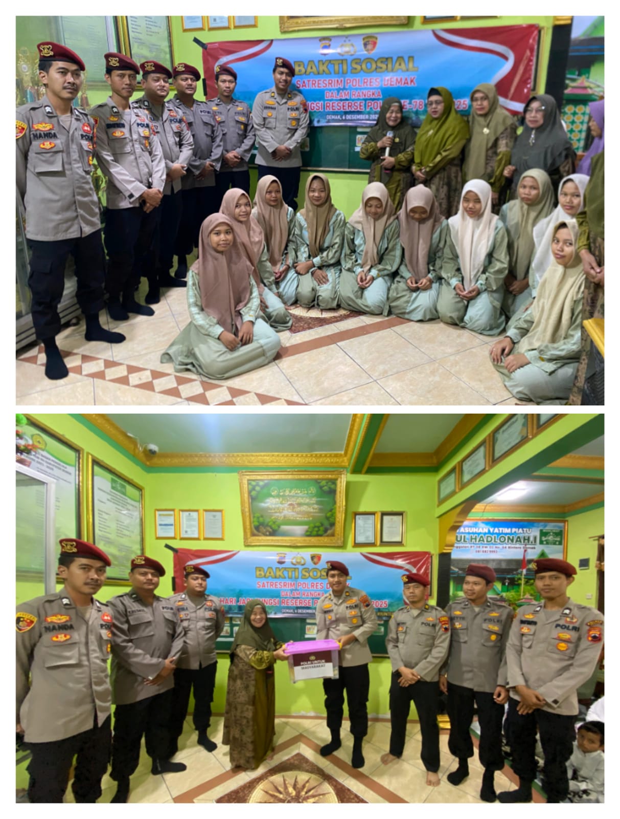 Demak – Dalam rangka memperingati Hari Ulang Tahun (HUT) ke-78 Reserse Polri, jajaran personel Satuan Reserse Kriminal (Satreskrim) Polres Demak, melaksanakan kegiatan bhakti sosial dan doa bersama di Panti Asuhan Darul Hadlonah, Kelurahan Bintoro Kecamatan Demak Kabupaten Demak, Sabtu (6/12/2025).