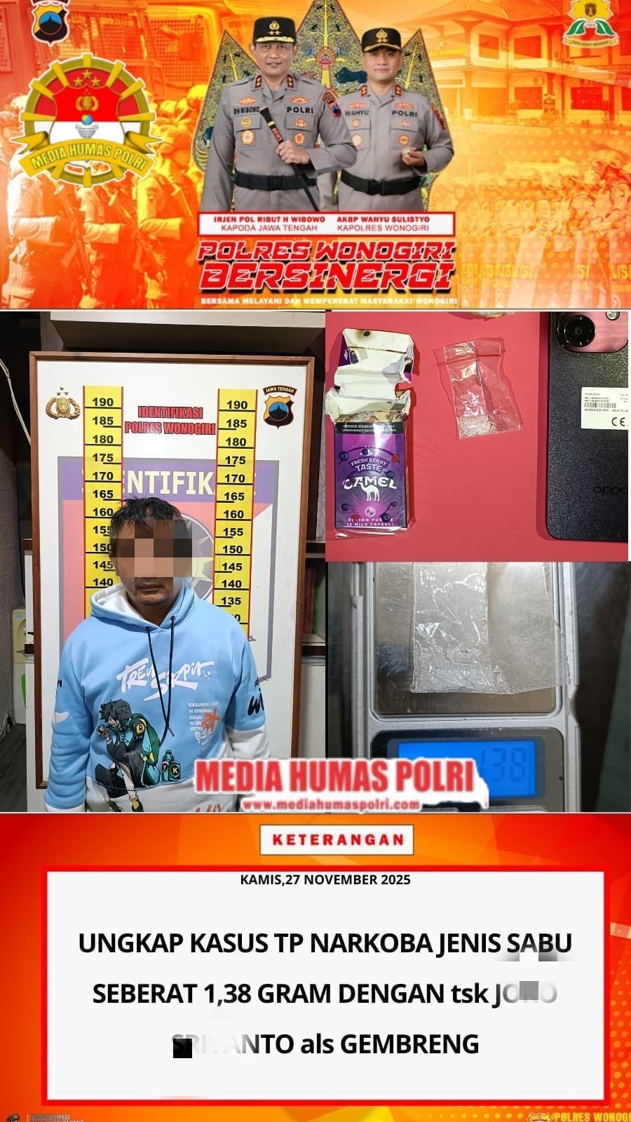 Sat Resnarkoba Polres Wonogiri berhasil mengungkap kasus penyalahgunaan narkotika jenis sabu di wilayah Ngadirojo. Seorang pria ber inisial JK S alias Gembreng (41) ditangkap pada Rabu (26/11/2025) sekitar pukul 19.30 WIB di kawasan bekas SPBU Mobil Indostation, Dusun Manggis, Ngadirojo Kidul..