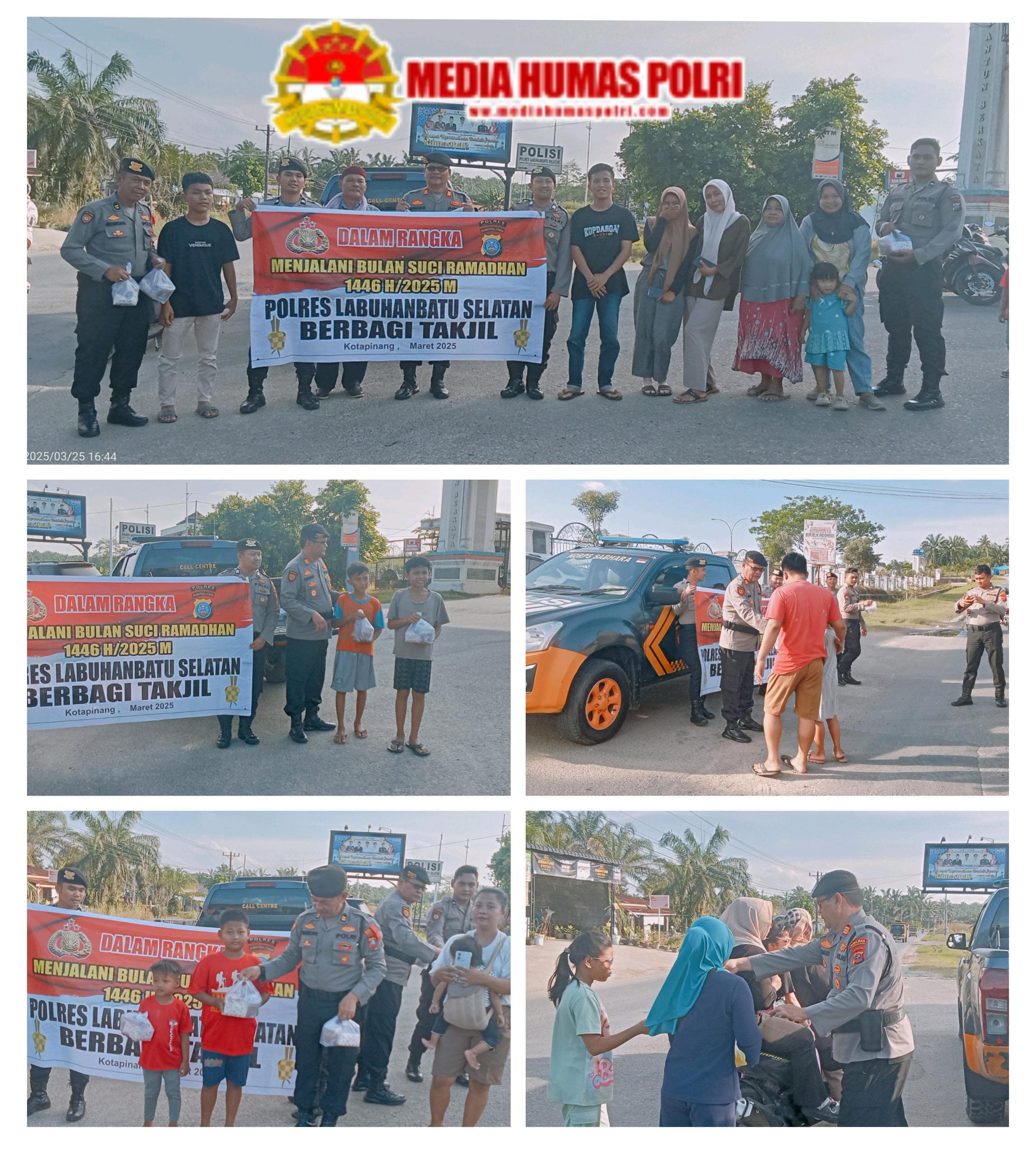 Satuan Samapta (Sat Samapta) Polres Labuhanbatu Selatan menggelar aksi sosial dengan membagikan takjil gratis kepada masyarakat dan pengendara yang melintas di Jalan Lintas Sumatera, tepatnya di depan Mapolres Labuhanbatu Selatan gerbang Kantor Bupati Labuhanbatu Selatan, Desa Sosopan, Kecamatan Kotapinang, Selasa (25/3/2025).