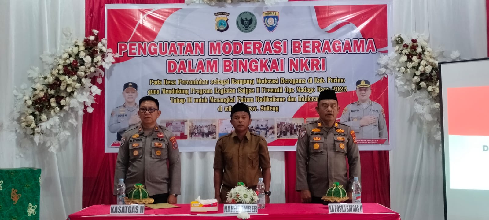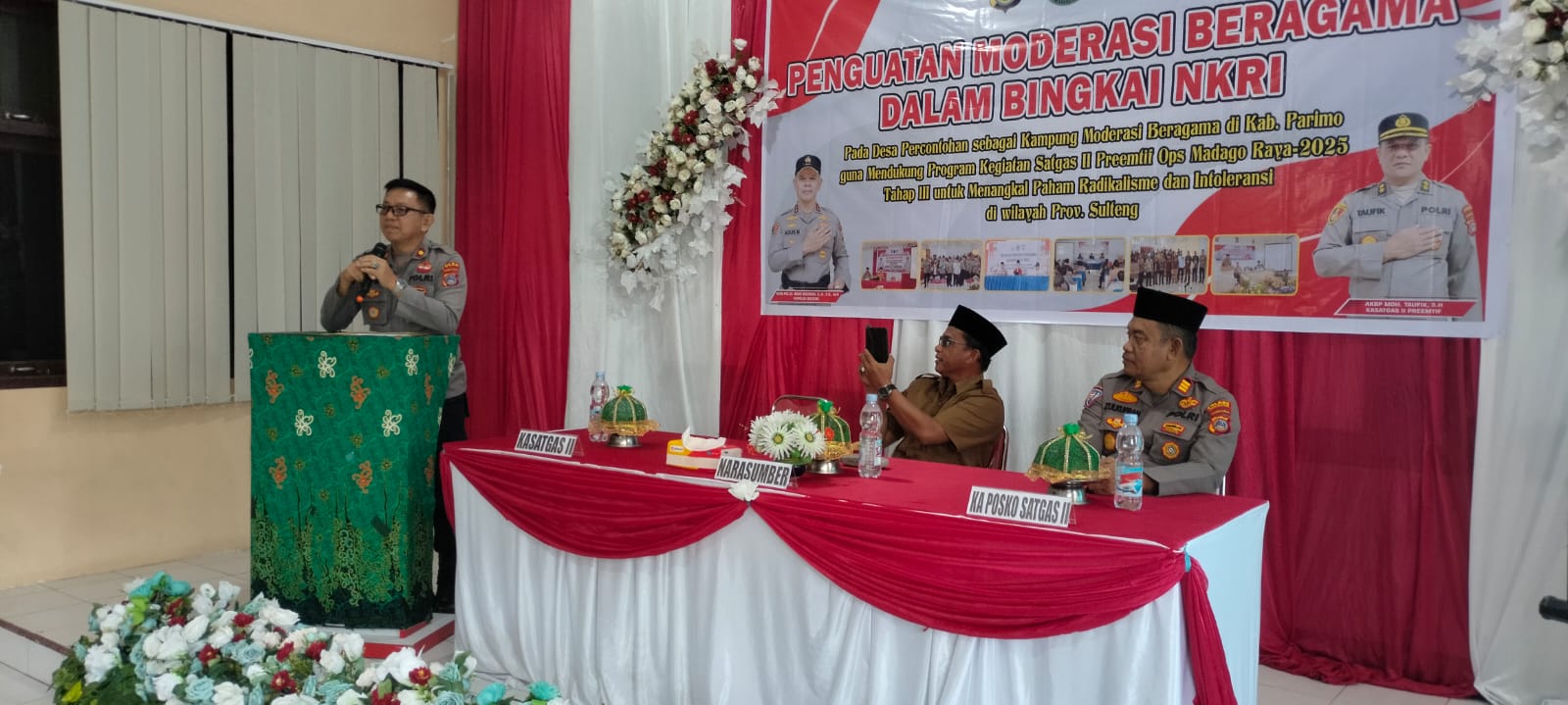 Dalam sambutannya, Kompol Mat Syukri menegaskan kegiatan ini merupakan terobosan inovatif Satgas II Preemtif dalam membendung paham radikal. Parimo dipilih sebagai desa percontohan Kampung Moderasi Beragama karena dinilai memiliki masyarakat plural yang bisa menjadi teladan nasional dalam mewujudkan perdamaian di tengah kemajemukan.