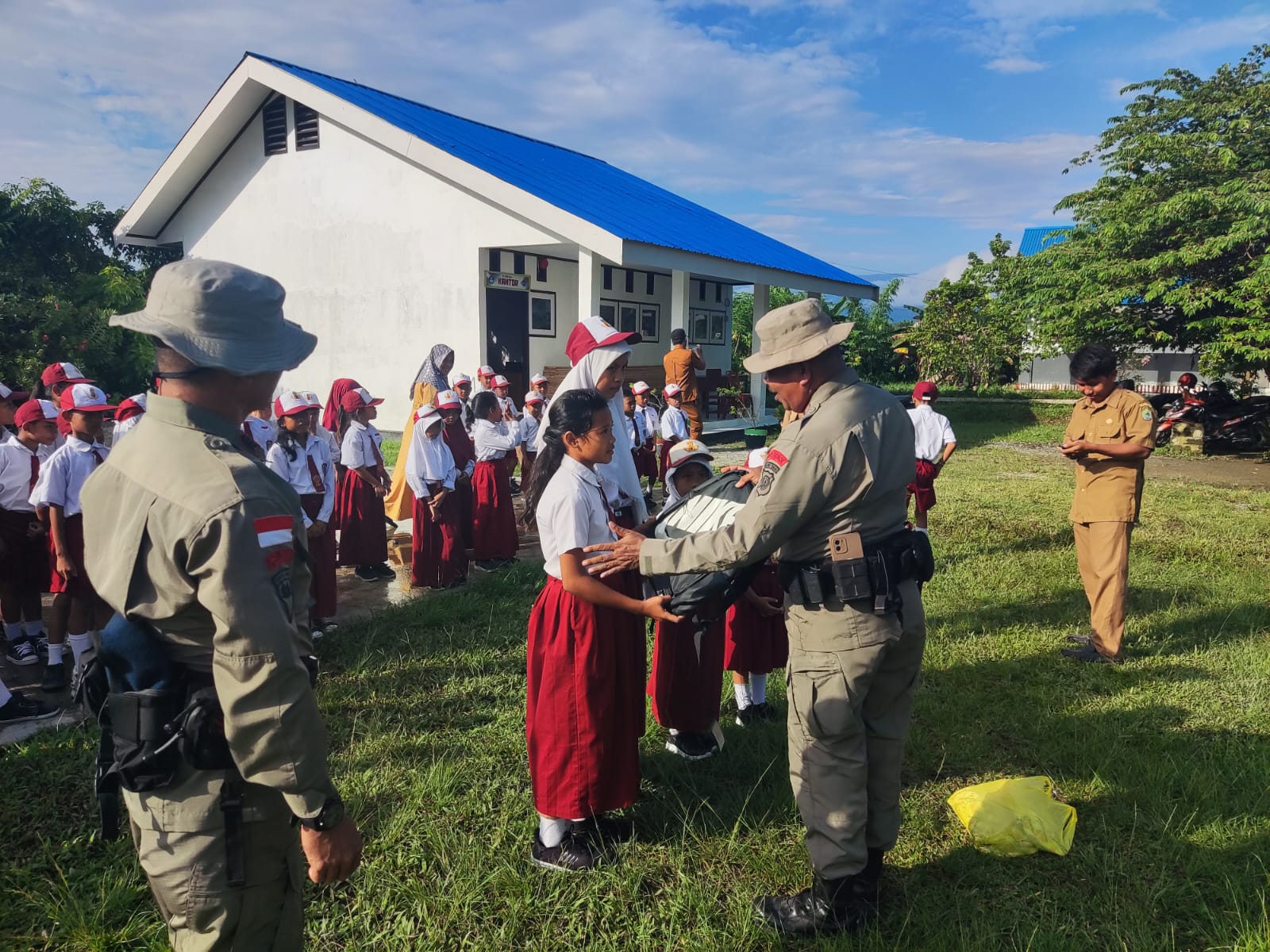 Usai pelaksanaan upacara, personel pos kamtibmas membagikan sarana kontak kepada siswa berupa tas sekolah dan alat tulis. Menariknya, pembagian hadiah ini dilakukan melalui kuis kebangsaan yang disambut semangat oleh para siswa.