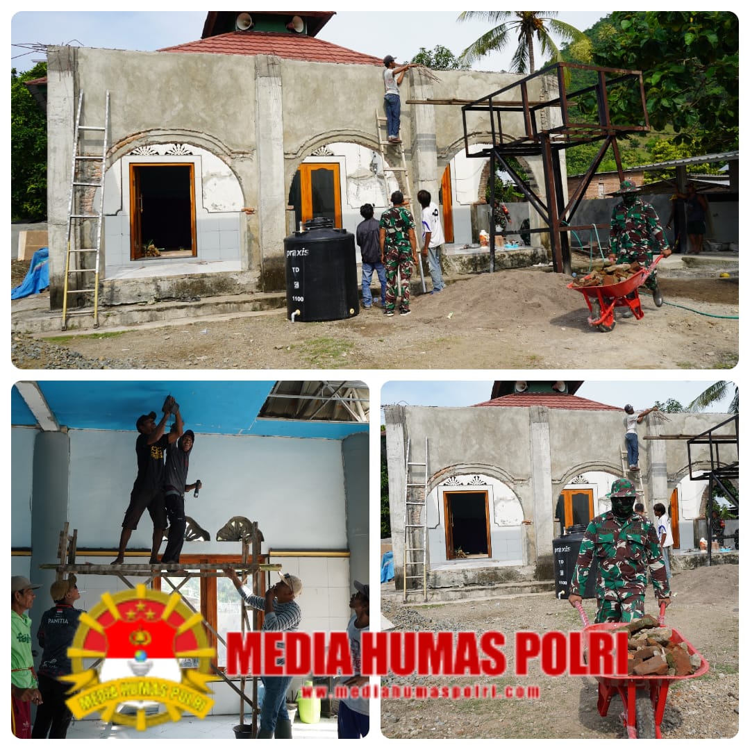 Tampak Satgas TMMD Kodim 1628 bersama masyarakat bergotong royong mengerjakan rehab mesjid untuk kenyamanan bersama saat melaksanakan ibadah.
