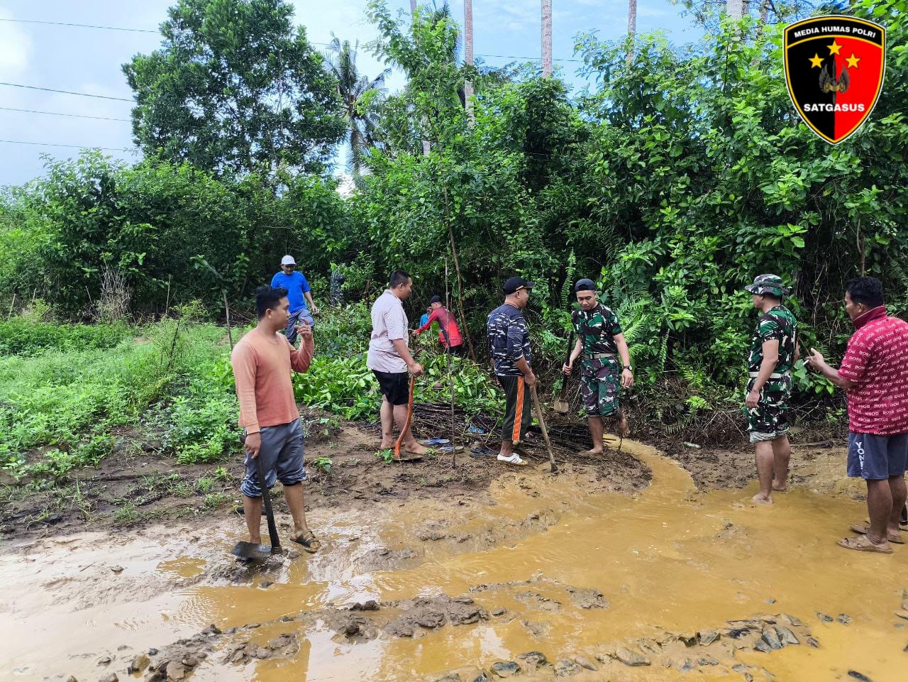 Akses jalan terputus, Personel Satgas Pamtas RI-Malaysia Yonkav 12/BC Pos Gabma Temajuk bergotong-royong perbaiki akses jalan utama Desa Temajuk, Bersama warga di Desa Temajuk, Kecamatan Paloh, Kabupaten Sambas. Minggu (19/1/2025).
