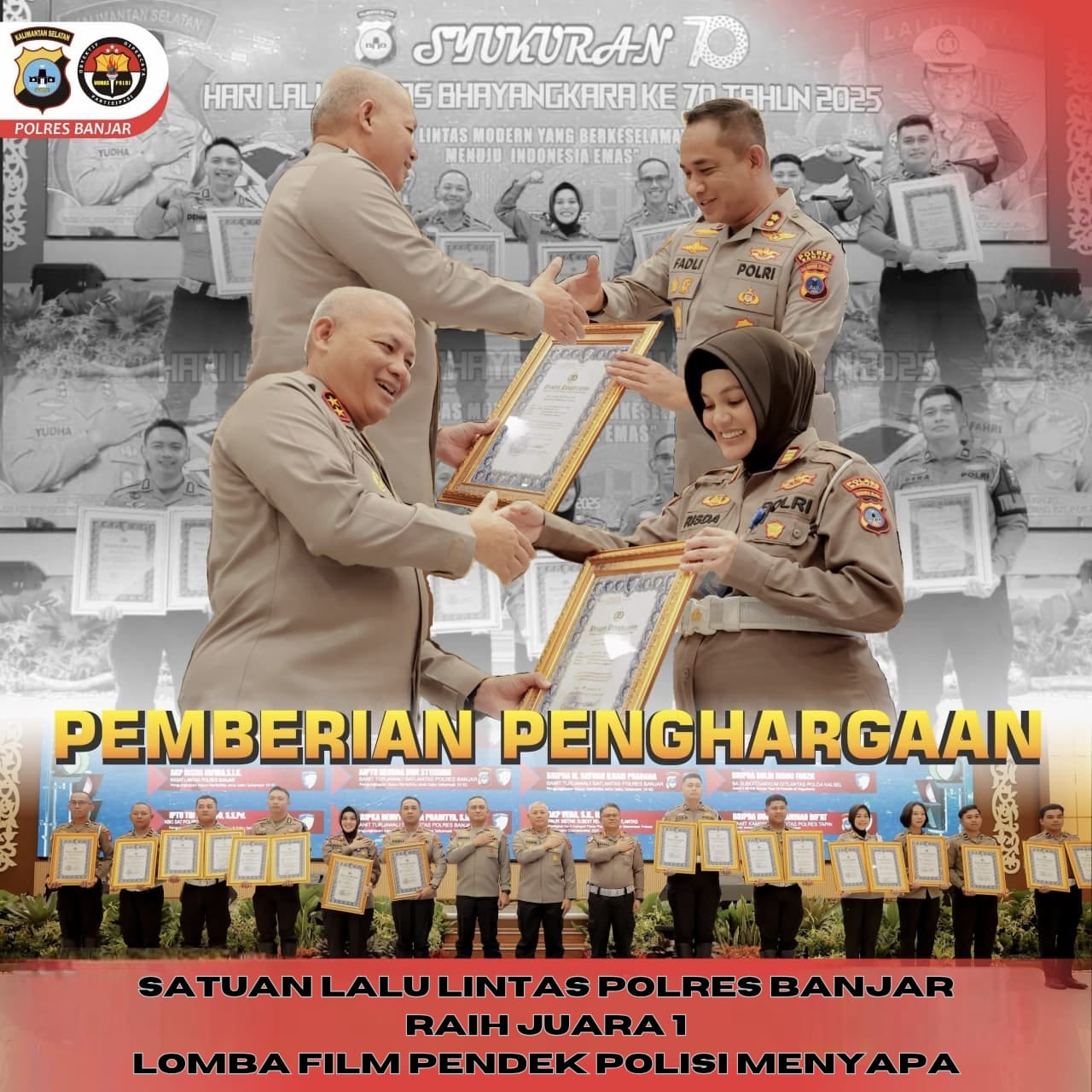Pada acara peringatan dan syukuran Hari Lalu Lintas Bhayangkara ke-70, Kapolda Kalsel Irjen Pol Rosyanto Yudha Hermawan umumkan Jajaran Satlantas Polres Banjar menjadi pemenang Lomba Film Pendek Polisi Menyapa.