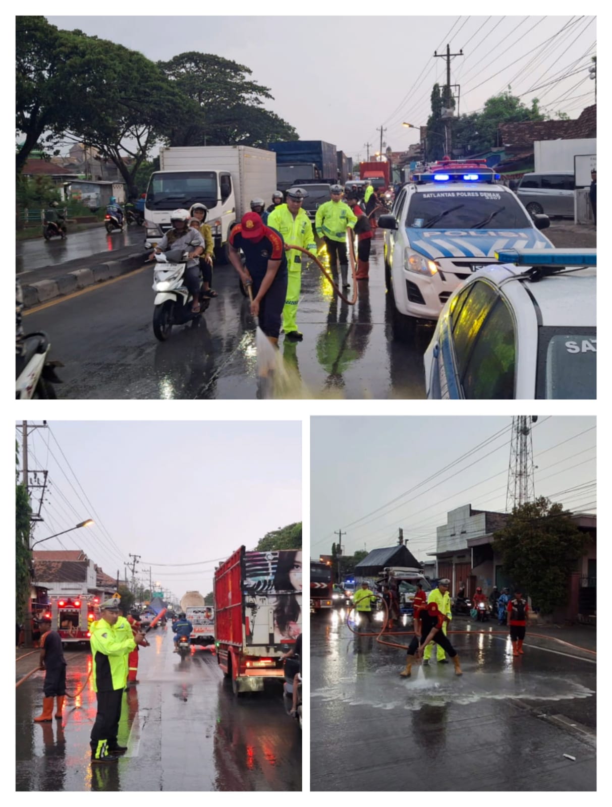 Menyikapi situasi darurat ini, Satlantas Polres Demak bertindak cepat. Mereka menjalin sinergi dengan petugas Pemadam Kebakaran (Damkar) Kabupaten Demak untuk menggelar operasi pembersihan jalan secara masif dari material lumpur dan tanah yang berpotensi memicu kecelakaan.