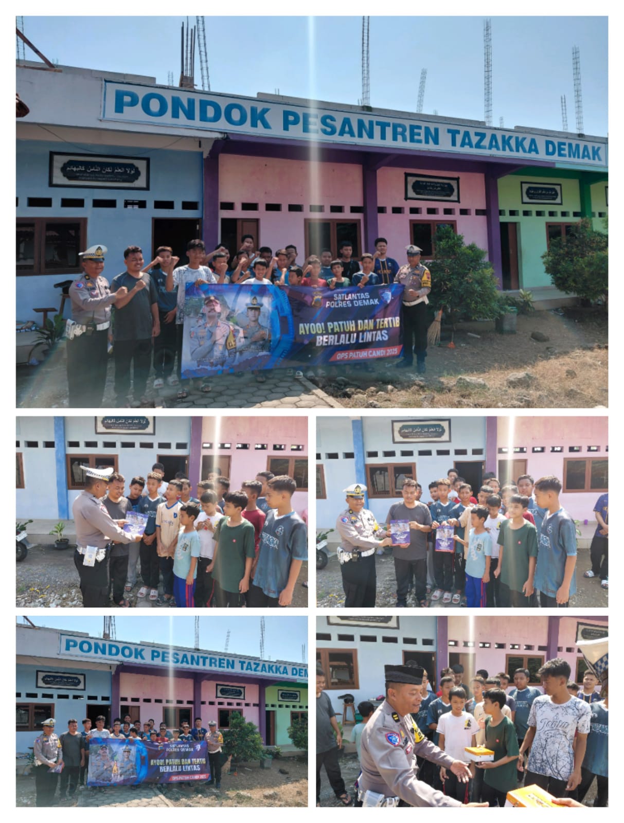Satuan Lalu Lintas (Satlantas) Polres Demak menggelar kegiatan bakti sosial sekaligus sosialisasi kepatuhan berlalu lintas di Pondok Pesantren Tazzaka, Desa Katonsari, Kecamatan Demak. Dalam kegiatan tersebut, ratusan paket nasi kotak dibagikan kepada para santri.