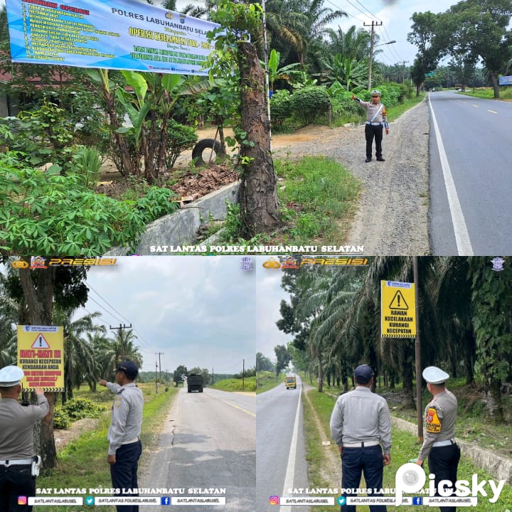 Satuan Lalu Lintas (Satlantas) Polres Labuhanbatu Selatan terus menggencarkan Operasi Keselamatan Toba 2025 dengan pemasangan spanduk dan rambu keselamatan di sepanjang Jalan Lintas Sumatera (Jalinsum), Kabupaten Labuhanbatu Selatan, Rabu (19/2/2025).
