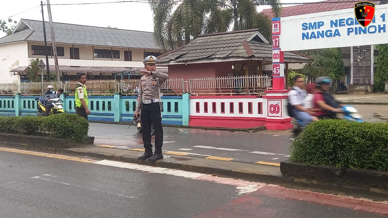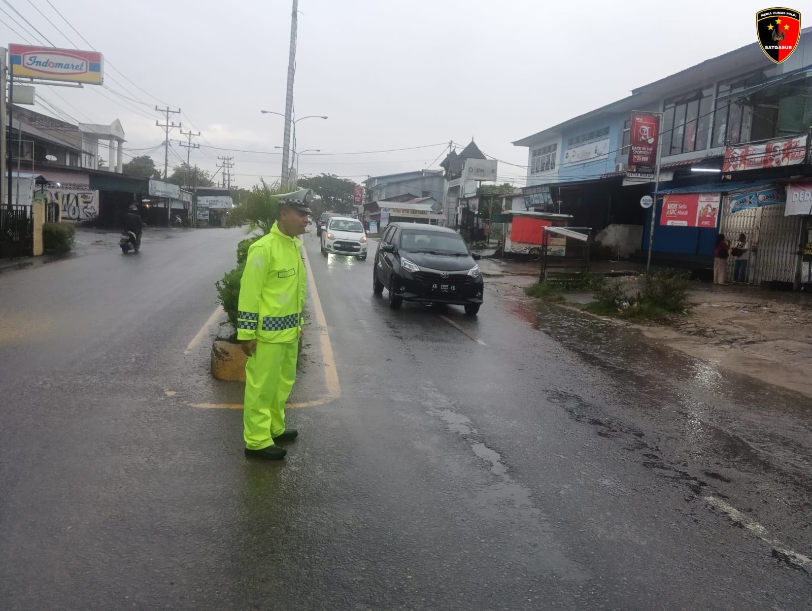 Meski hujan,Pengaturan Lalu Lintas (Gatur Lalin) sebagai bentuk pelayanan tetap di lakukan Satlantas Polres Melawi, Senin (13/10/25)