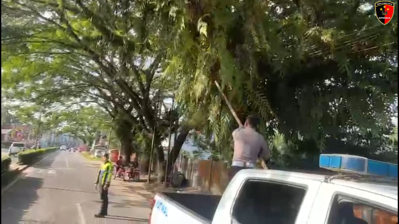 “Kami menurunkan ranting kering yang berada di pohon peneduh di tepi jalan tentu dapat menimbulkan rawan tertimpa, usaha kami memastikan dapat di evakuasi dengan aman,” terang Kapolres Melawi.