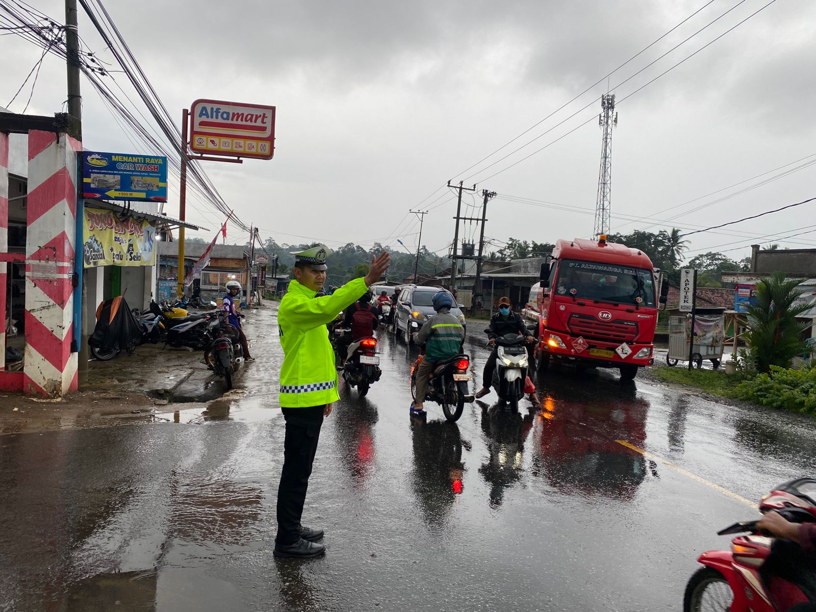 Brigpol Haffiz Ahmadan menjadi garda terdepan dalam kegiatan pengaturan lalu lintas yang dilaksanakan pada Minggu sore sekitar pukul 17.00 WIB, tepatnya di Simpang Bernung titik yang kerap mengalami kepadatan kendaraan khususnya di akhir pekan.