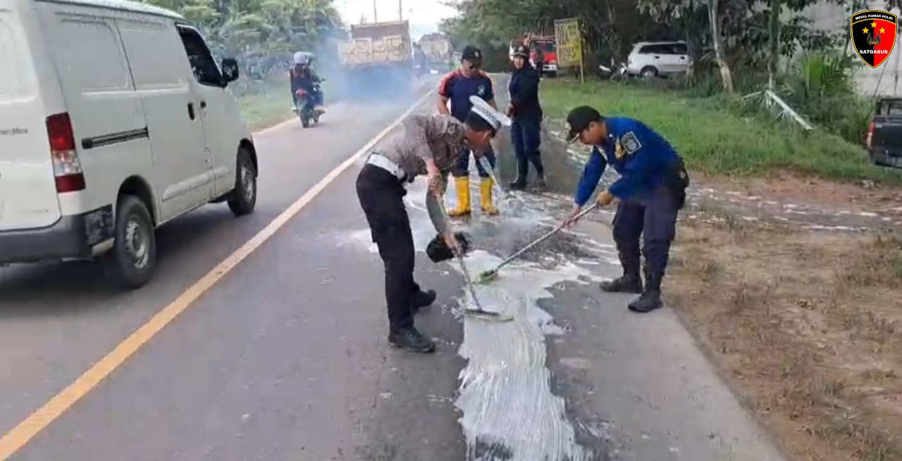 Satlantas Polres Sekadau bersama Dinas Damkar Kabupaten Sekadau melakukan pembersihan tumpahan solar di Jalan Merdeka Timur, dekat BTN AMS, Desa Mungguk, Kecamatan Sekadau Hilir, Jumat (15/8/2025).
