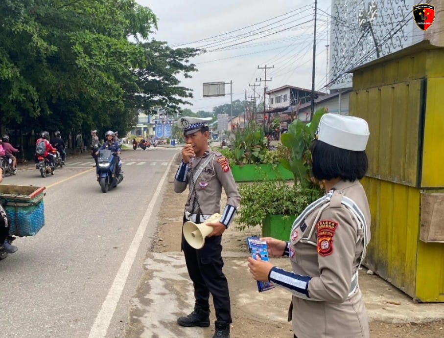 Dalam kegiatan tersebut, personel Satlantas tidak hanya memberikan imbauan lisan, tetapi juga membagikan brosur keselamatan lalu lintas sebagai bahan edukasi tambahan kepada para pengendara.