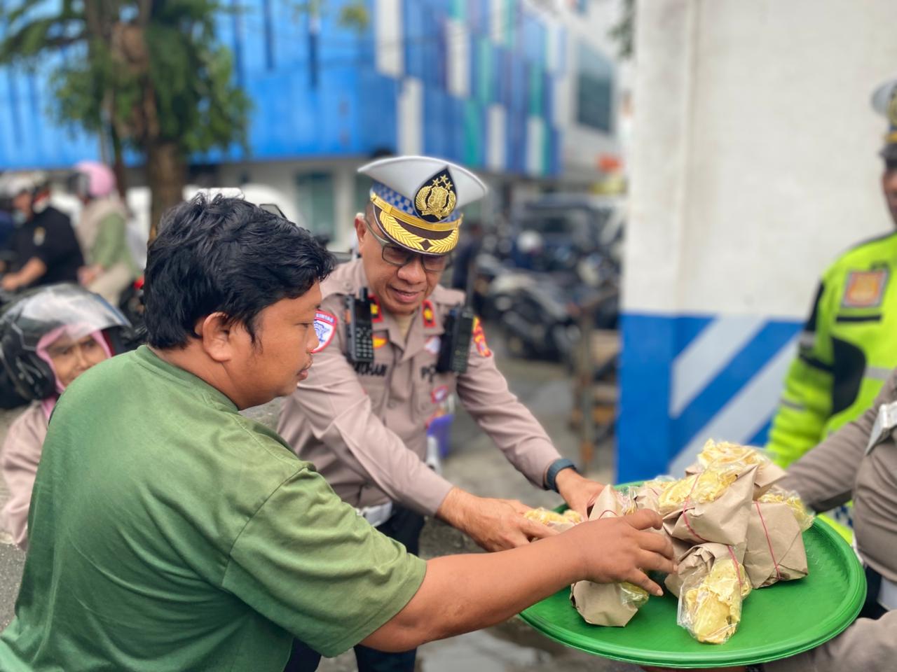 Selain membagikan makanan, personel Satlantas juga memanfaatkan momen kebersamaan ini untuk berdialog langsung dengan masyarakat, menyampaikan pesan-pesan kamtibmas dan imbauan tertib berlalu lintas.