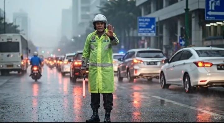 Dengan menggunakan jas hujan dan perlengkapan keselamatan, personel Satlantas mengatur kendaraan yang mulai padat akibat cuaca buruk. Tindakan ini dilakukan untuk memastikan kelancaran arus serta mencegah potensi terjadinya kecelakaan, mengingat kondisi jalan yang licin dan pandangan yang terbatas.