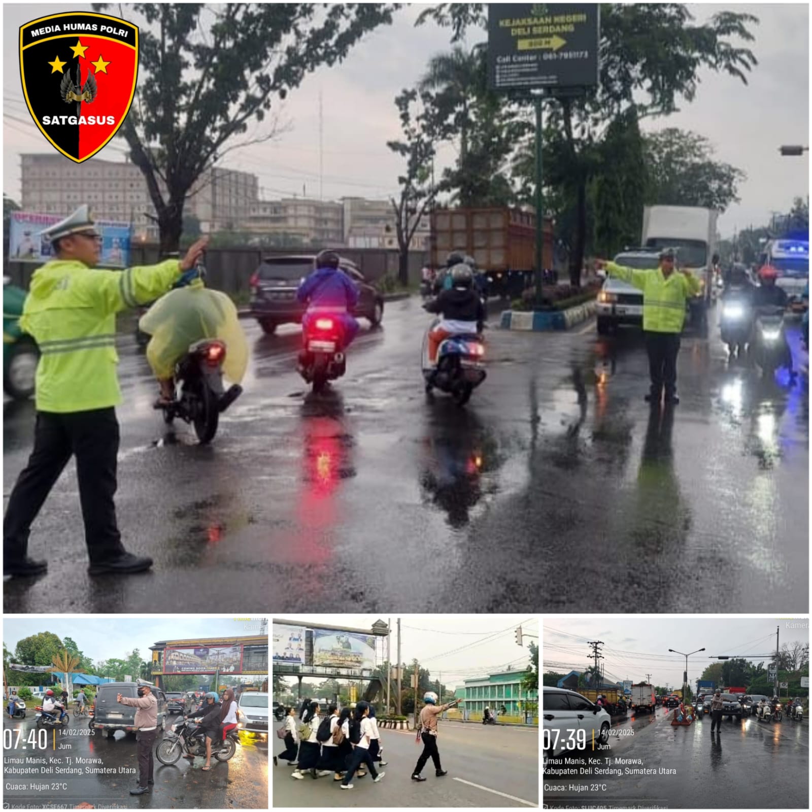 Satuan Lalu Lintas (Sat Lantas) Polresta Deli Serdang, melakukan pengaturan lalu lintas di Jalan Lintas Medan – Lubuk Pakam, Jumat (14/02/25).