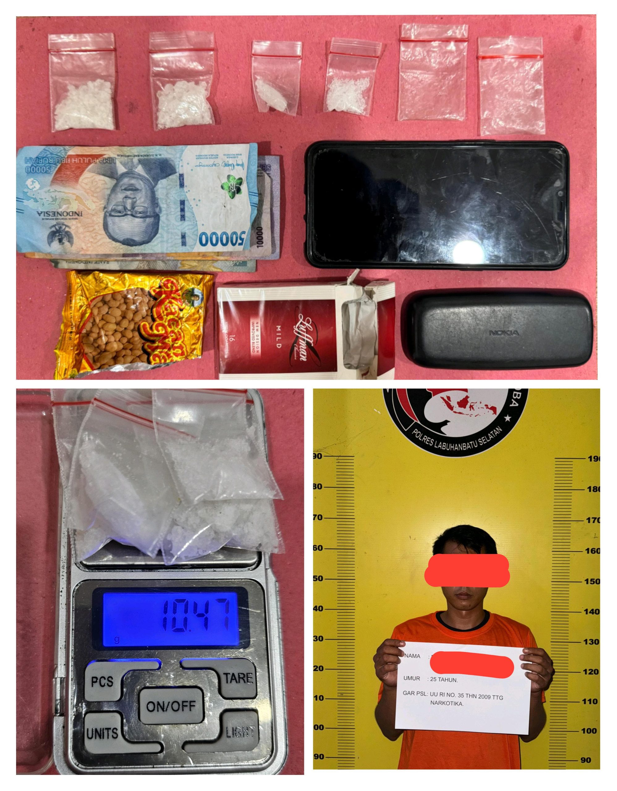 Kapolres Labuhanbatu Selatan, AKBP Aditya S.P. Sembiring, M.Si, melalui Kasi Humas AKP Sujono menyampaikan bahwa setelah dilakukan pengintaian, tim berhasil menangkap pelaku dan selanjutnya dilakukan penggeledahan. Dari tangan tersangka, polisi menyita 4 paket kecil sabu dengan berat bruto 10,49 gram yang disembunyikan dalam bungkus snack dan kotak rokok. Selain itu, turut diamankan dua unit handphone serta uang tunai sebesar Rp79.000.