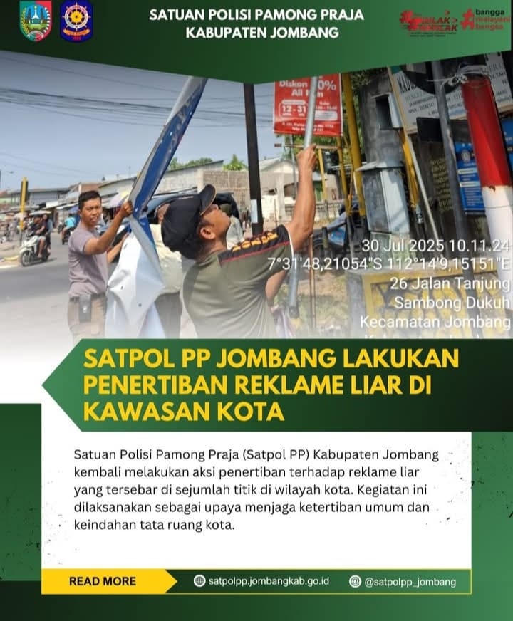 Satuan Polisi Pamong Praja (Satpol PP) Kabupaten Jombang kembali melakukan aksi penertiban terhadap reklame liar yang tersebar di sejumlah titik di wilayah kota pada Hari Rabu (30/7/2025) Kegiatan ini dilaksanakan sebagai upaya menjaga ketertiban umum dan keindahan tata ruang kota.