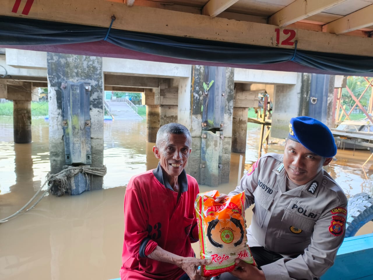 Dalam kegiatan tersebut, personel Satpolairud membagikan paket sembako kepada para pekerja di sekitar dermaga, antara lain buruh kapal, tukang ojek sungai, hingga pedagang kecil.