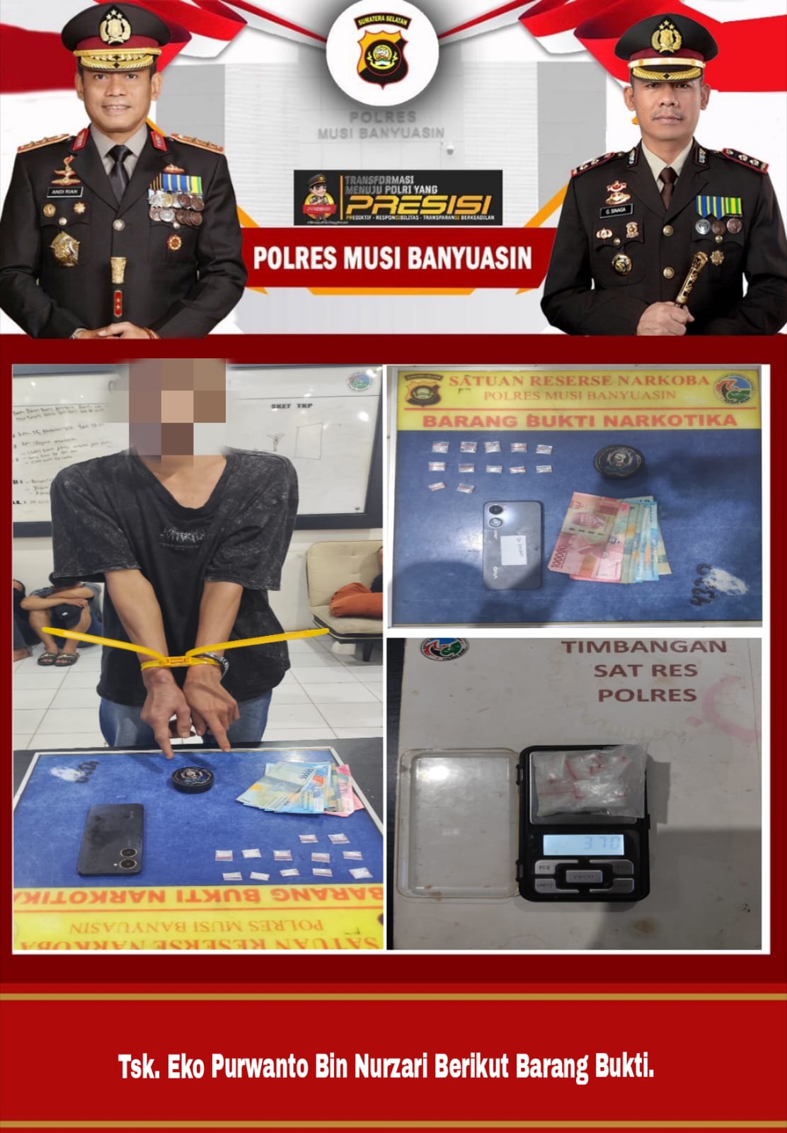 Kasat Narkoba Polres Muba IPTU Budi Mulya melalui Kasi Humas Polres Muba IPTU Hutahaean mengatakan kedua tersangka sudah menjadi Target operasi (TO) Satres Narkoba. Penangkapan para tersangka setelah tim mendapatkan laporan mengenai peredaran narkoba.