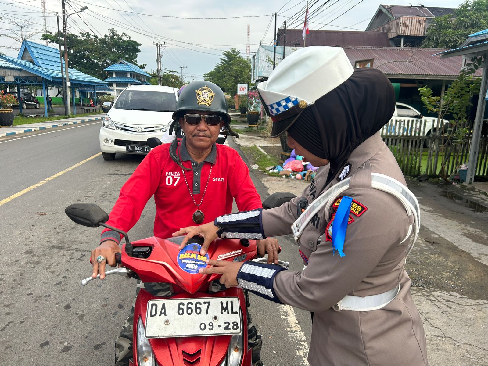 Satuan Lalu lintas Polres Batola Himbau dan bagikan Brosur kepada Pengguna jalan untuk tertib berlalu lintas