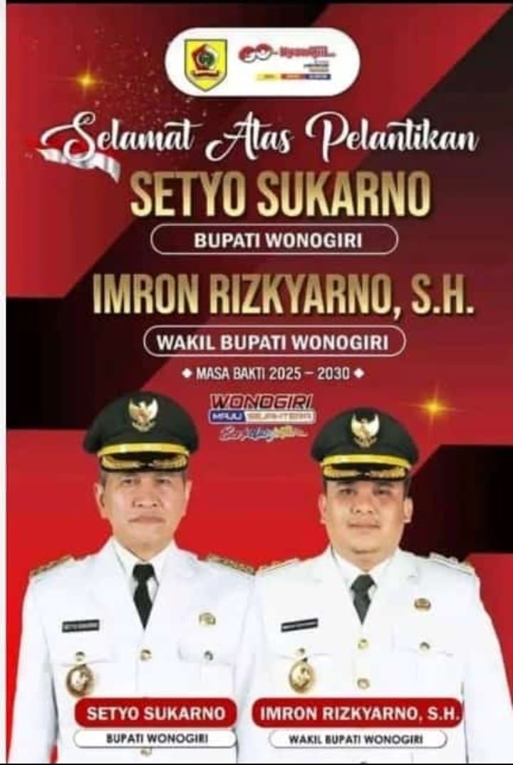 Bupati dan wakil Bupati Wonogiri terpilih , Bapak Setyo Sukarno-Imron Rizkyarno, Kamis (20/2/2025) menjalani pelantikan sebagai Bupati-Wakil Bupati Wonogiri untuk periode 2025-2030. Pelantikan, dilakukan langsung oleh Presiden Prabowo Subianto di Istana Presiden Jakarta, bersama 961 Kepala Daerah-Wakil Kepala Daerah dari seluruh pelosok Nusantara.