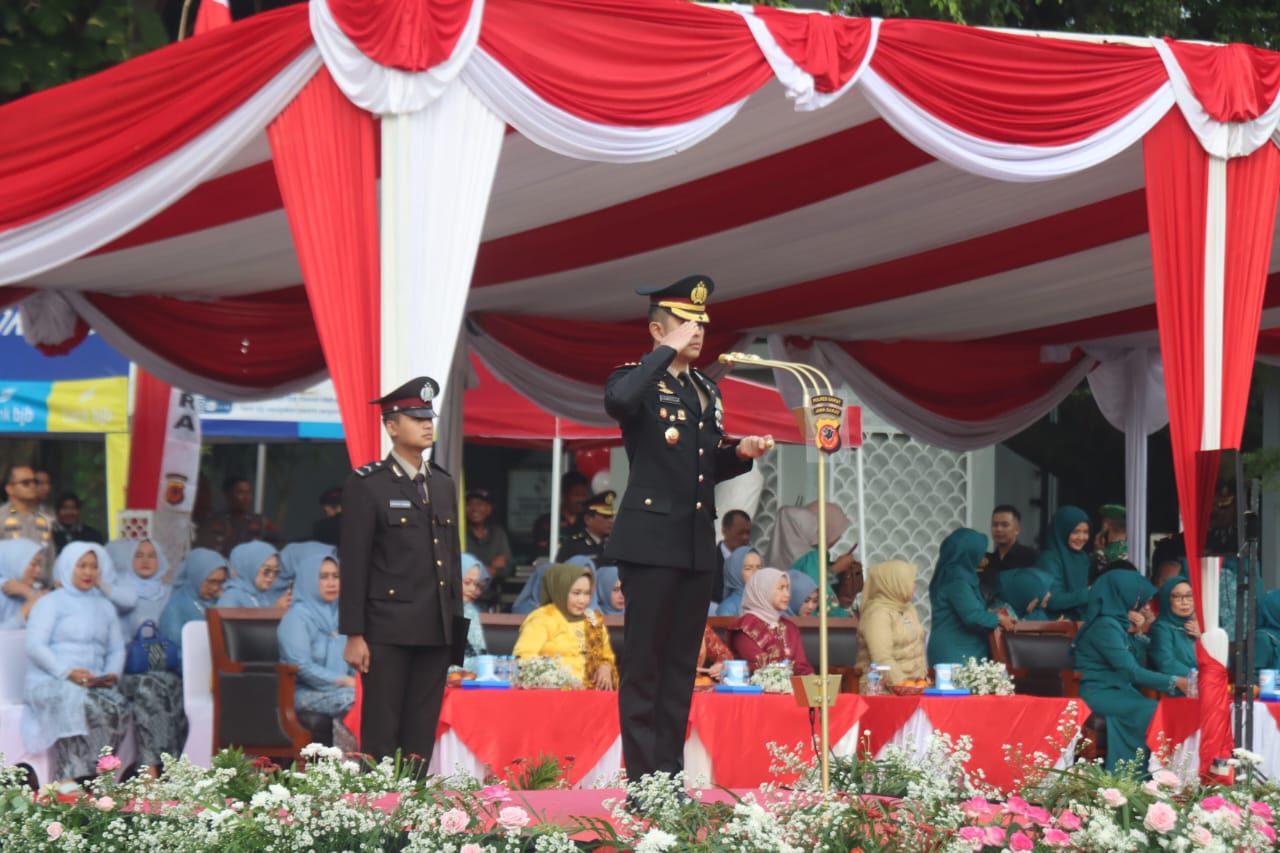 Upacara berlangsung tertib dan meriah, dengan barisan peserta yang terdiri dari berbagai satuan Polri, TNI, instansi pemerintah daerah, Satpol PP, Dishub, BPBD, Satpam, hingga pelajar PKS dan Pramuka.