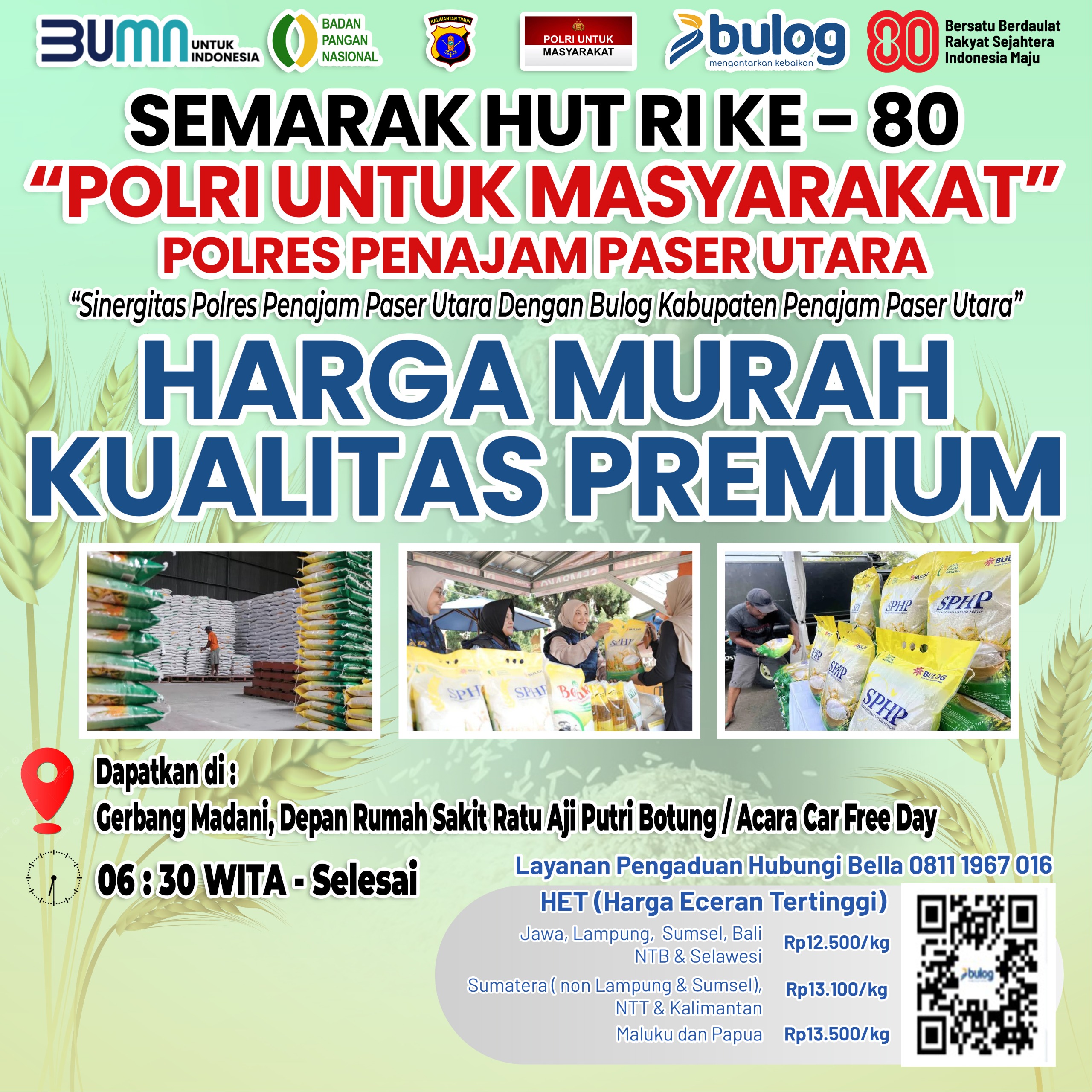 Dalam rangka memeriahkan Hari Ulang Tahun ke-80 Kemerdekaan Republik Indonesia, Polres Penajam Paser Utara (PPU) bersama Pemerintah Kabupaten PPU dan Perum Bulog akan menggelar rangkaian kegiatan yang menggabungkan olahraga bersama dan bazar beras premium harga murah untuk masyarakat. Jum’at 8/8/2025.