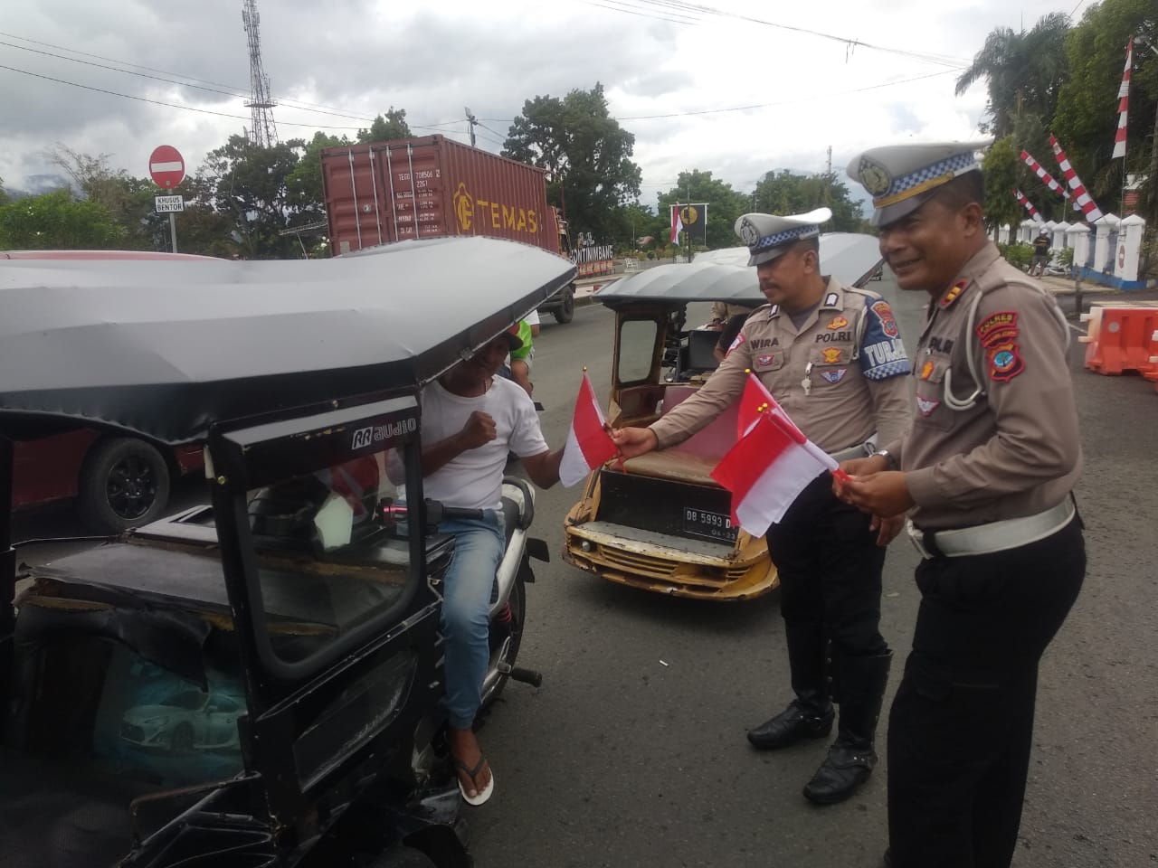 Selain Satuan Samapta, satuan Lalu Lintas Polres Kotamobagu juga melaksanakan pembagian bendera merah putih kepada pengendara yang melintas di depan Mako Satlantas jalan Ahmad Yani.