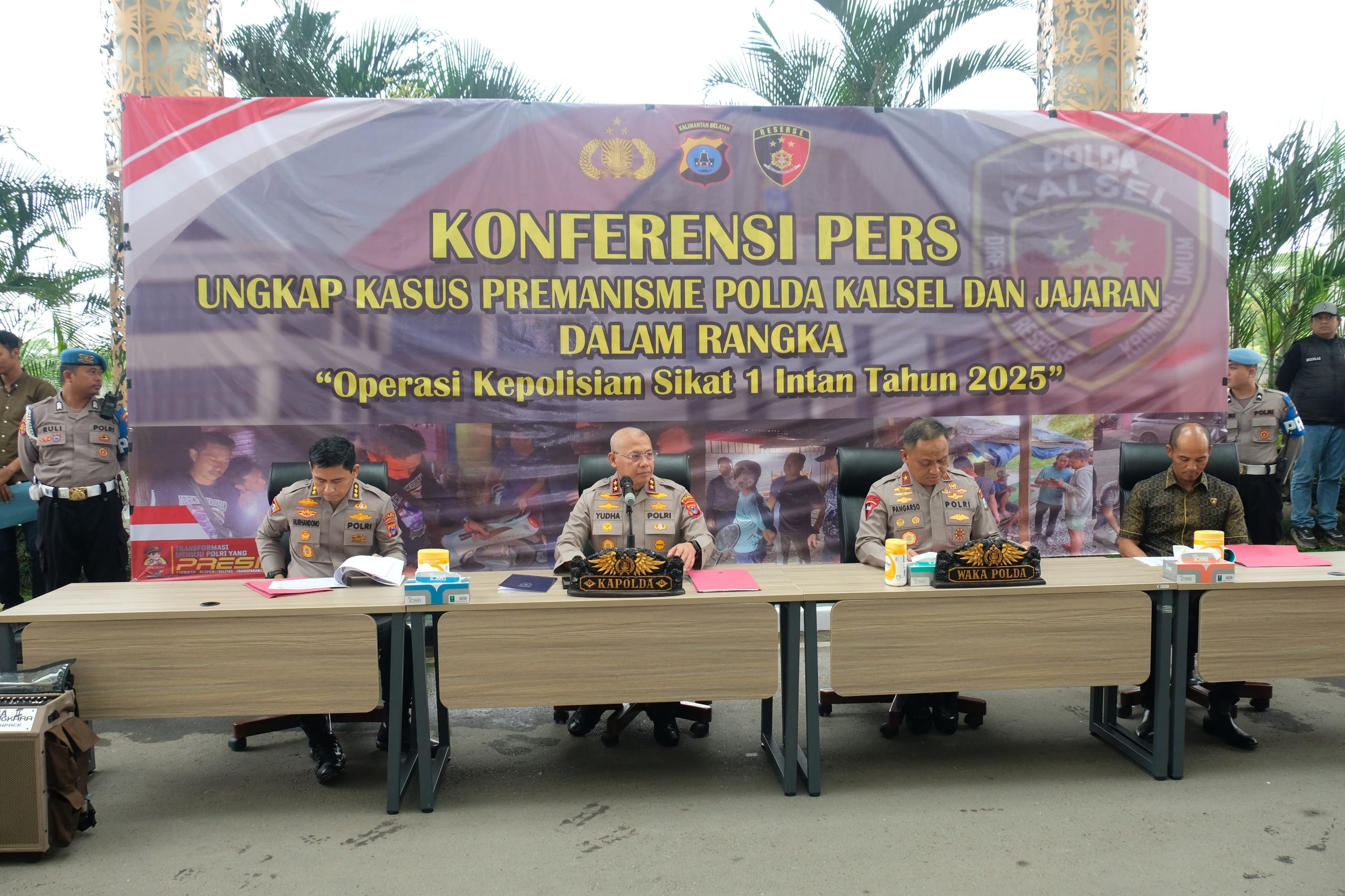 Kepolisian Daerah Kalimantan Selatan (Polda Kalsel) menggelar konferensi pers untuk mengungkap sejumlah kasus premanisme yang berhasil diungkap dalam Operasi Kepolisian Sikat 1 Intan Tahun 2025*. Acara digelar di Lobby Mapolda Kalsel, Banjarbaru, Jumat (9/5/2025), dipimpin langsung oleh Kapolda Kalsel Irjen Pol Rosyanto Yudha Hermawan, S.I.K., S.H., M.H. didampingi Wakapolda Kalsel Brigjen Pol Dr. Golkar Pangarso Rahardjo Winarsadi, S.H., S.I.K., M.H., Karo Ops Polda Kalsel Kombes Pol Nurhandono, S.I.K., M.H., dan Dir Reskrimum Polda Kalsel Kombes Pol Frido Situmorang, S.H., S.I.K. dihadiri Pejabat Utama Polda Kalsel dan Kasat Reskrim Jajaran Polda Kalsel.