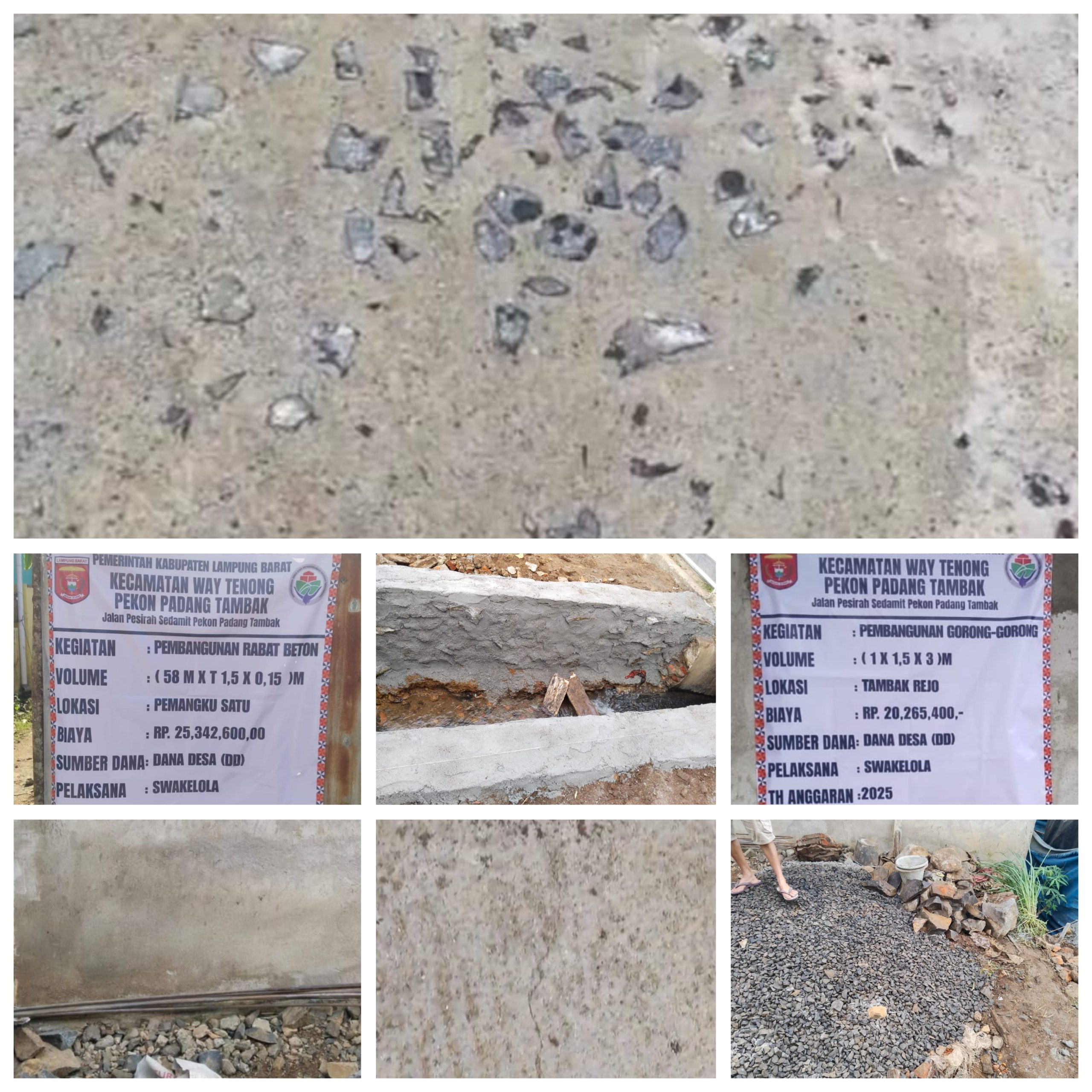 Sebelumnya diberitakan, proyek rabat beton di Pekon Padang Tambak yang bersumber dari Dana Desa (DD) Tahun Anggaran 2025 sudah rusak hanya dalam hitungan hari. Permukaan beton mengelupas dan retak, menimbulkan dugaan kuat kualitas bahan dan proses pengerjaan tidak sesuai RAB serta spek teknis.
