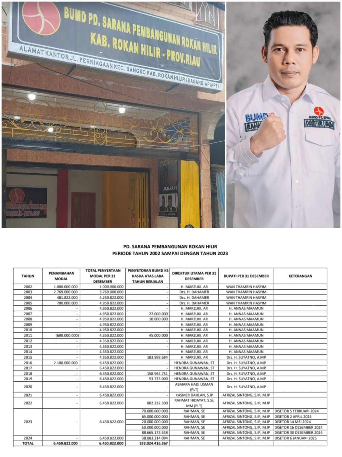 Sempat di issukan merugi, pedahal Badan Usaha Milik Daerah (BUMD) PT. SPRH Kabupaten Rokan Hilir telah melakukan setoran deviden kepada kas daerah (kasda) sebesar Rp Rp 293.665.173.538, –