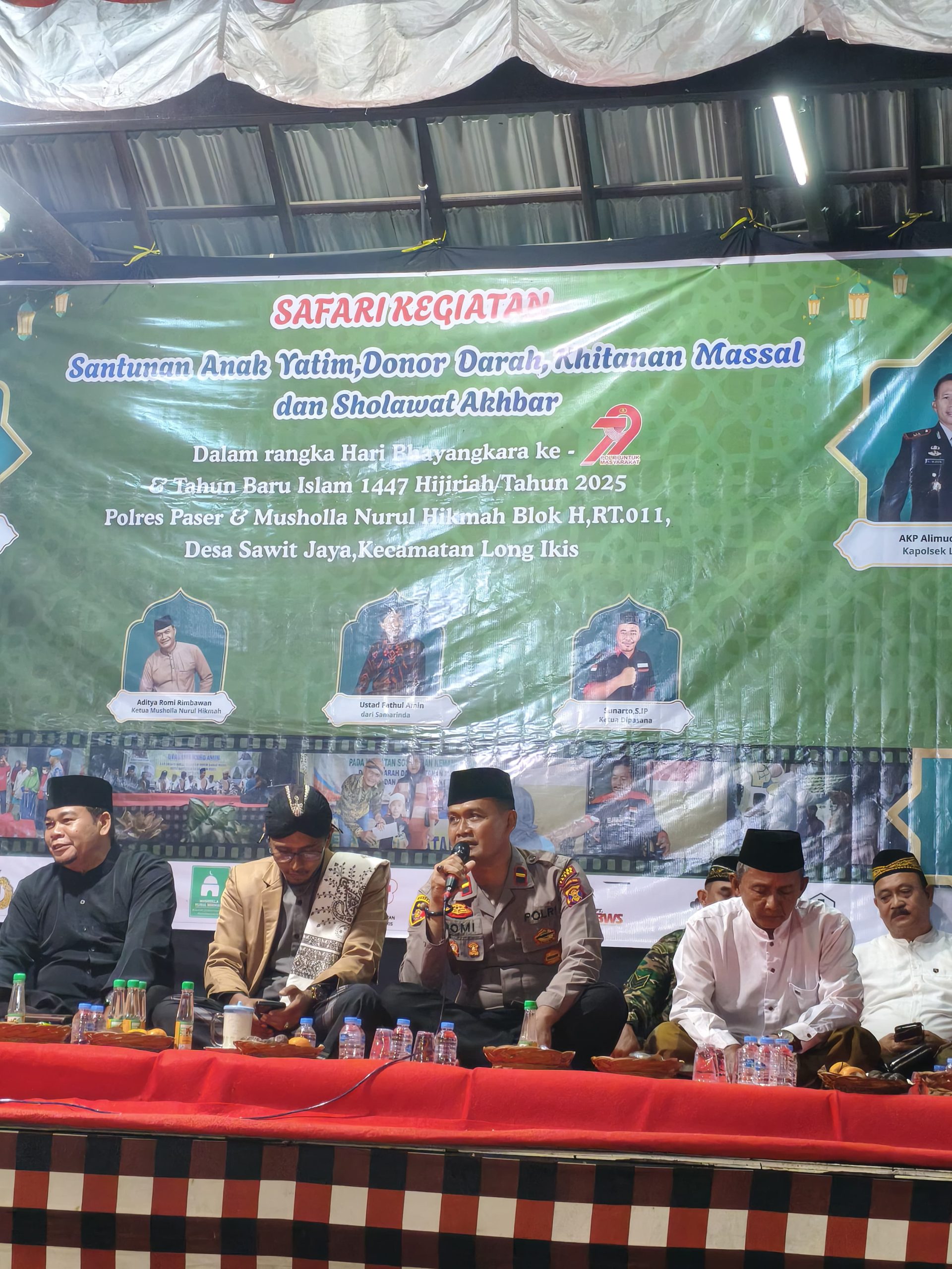 Dalam rangka memperingati Hari Bhayangkara ke-79 dan menyambut Tahun Baru Islam 1447 H, Polres Paser bersama Polsek Long Ikis menggelar kegiatan Sholawat Akbar yang berlangsung khidmat dan penuh semangat kebersamaan di Desa Sawit Jaya, Kecamatan Long Ikis, Kamis malam (26/6/2025).